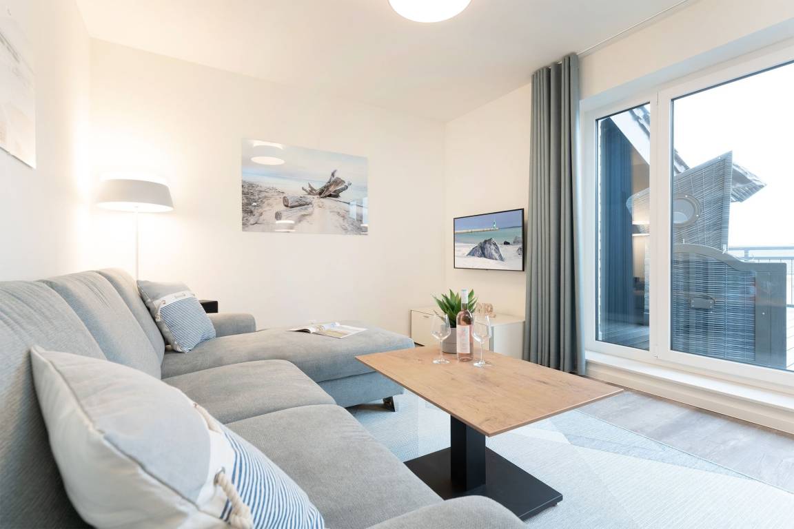 Der offene Wohn-, Ess- und Kochbereich empfängt Sie lichtdurchflutet und mit maritimer Gemütlichkeit. Auf dem kuscheligen Sofa, das sich mit wenigen Griffen zu einem weiteren Schlafplatz verwandeln lässt (ca. 140x200cm) können Sie den Urlaubstag entspannt vor dem TV ausklingen lassen. Durch die große Terrassentür gelangen Sie auf die möblierte Dachterrasse, auf der Sie ein Strandkorb zum Relaxen einlädt, hier lässt es sich an warmen Sommerabenden, als auch bei frischeren Temperaturen mit einer Decke gut aushalten.