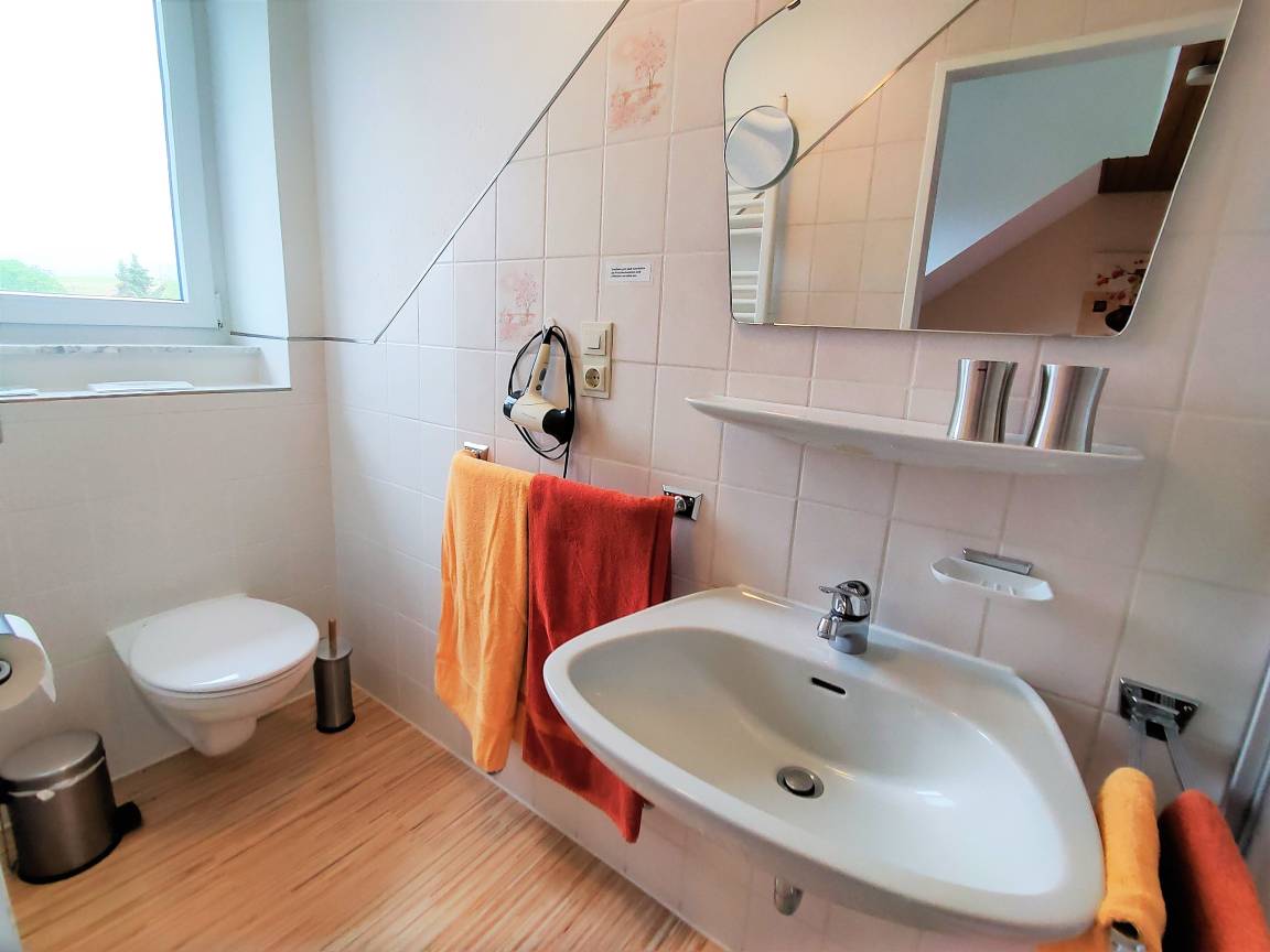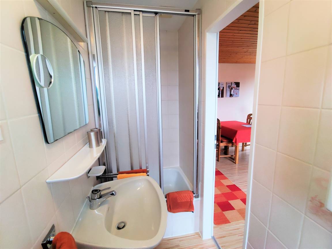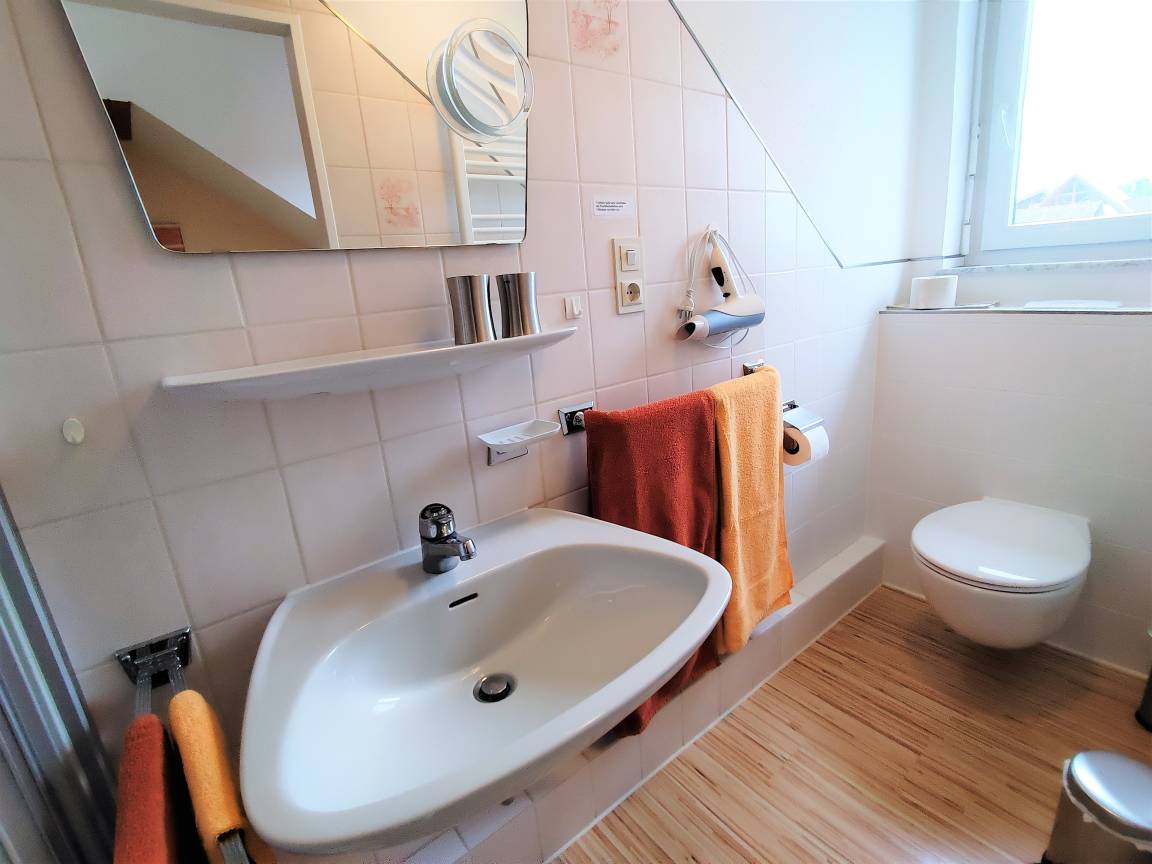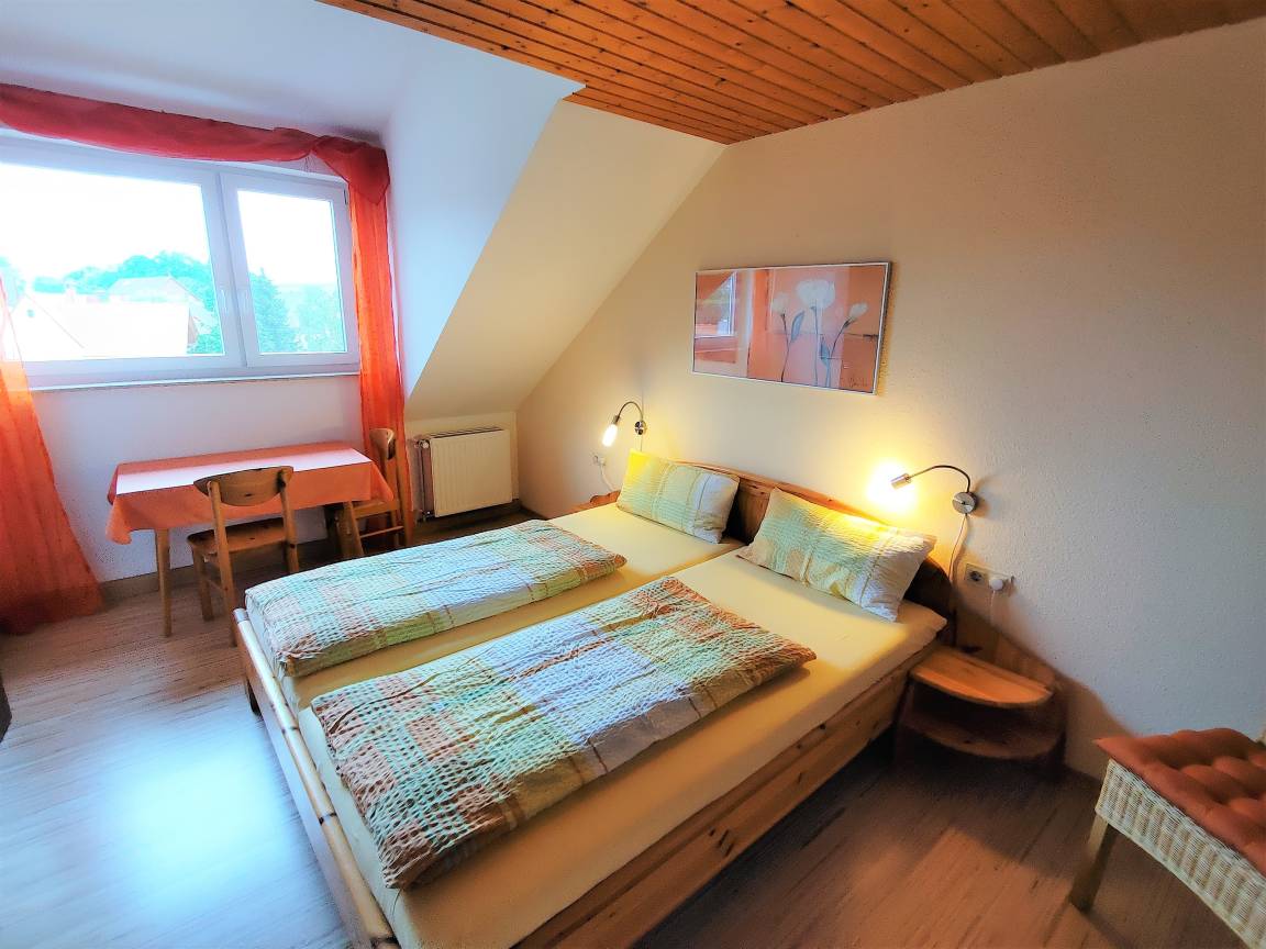 In der Ferienwohnung im DG befinden sich zwei Schlafzimmer mit Doppelbett sowie jeweils ein eigenes Badezimmer mit DU / WC. Ein Wohnzimmer mit Essplatz und Ausgang zum Balkon lädt zu Spieleabende oder gemeinschaftliches Beisammensein ein.