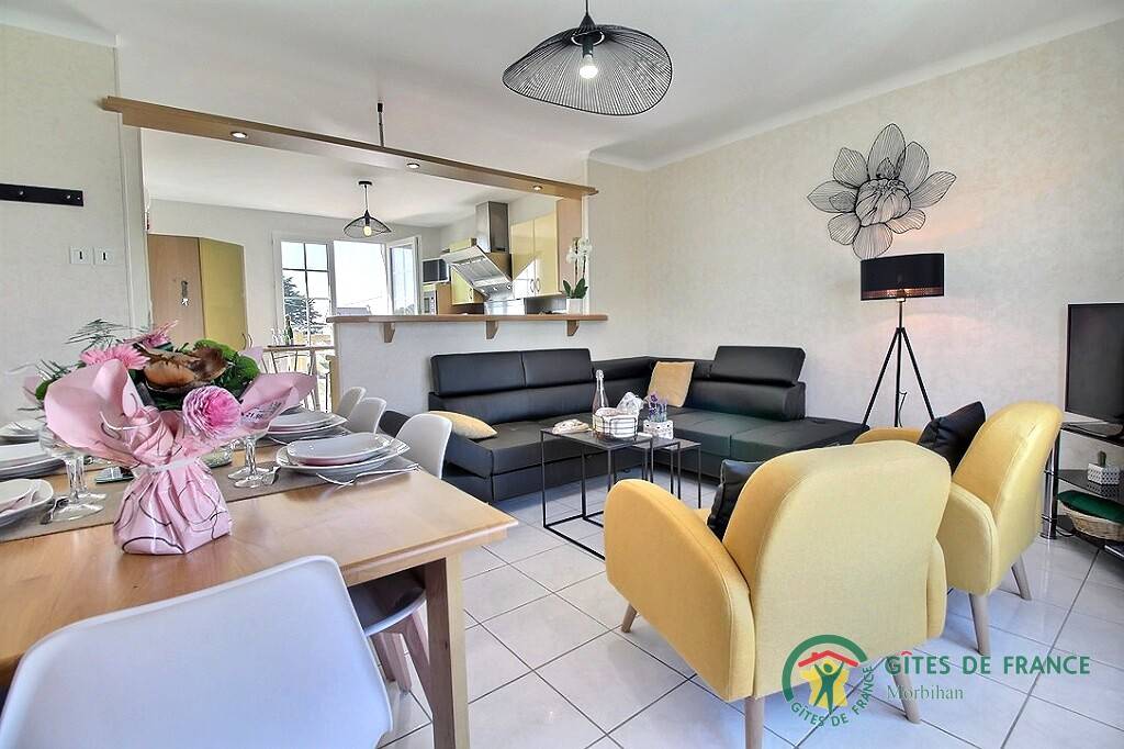„Gîte tout confort, spacieux et vue sur la mer. Nous avons passé un très bon week-end en famille. Nous avons fait de très bonnes balades, la presqu'île de Pénerf avec la tour des Anglais. Damgan et Kervoyal, ses grandes plages et petits bourg sympathiques.“