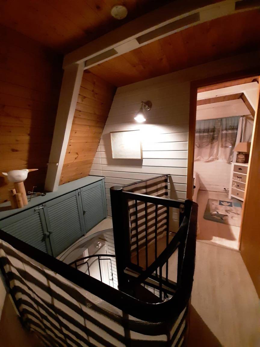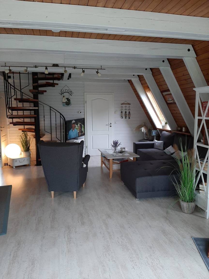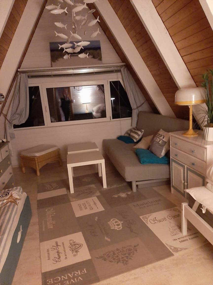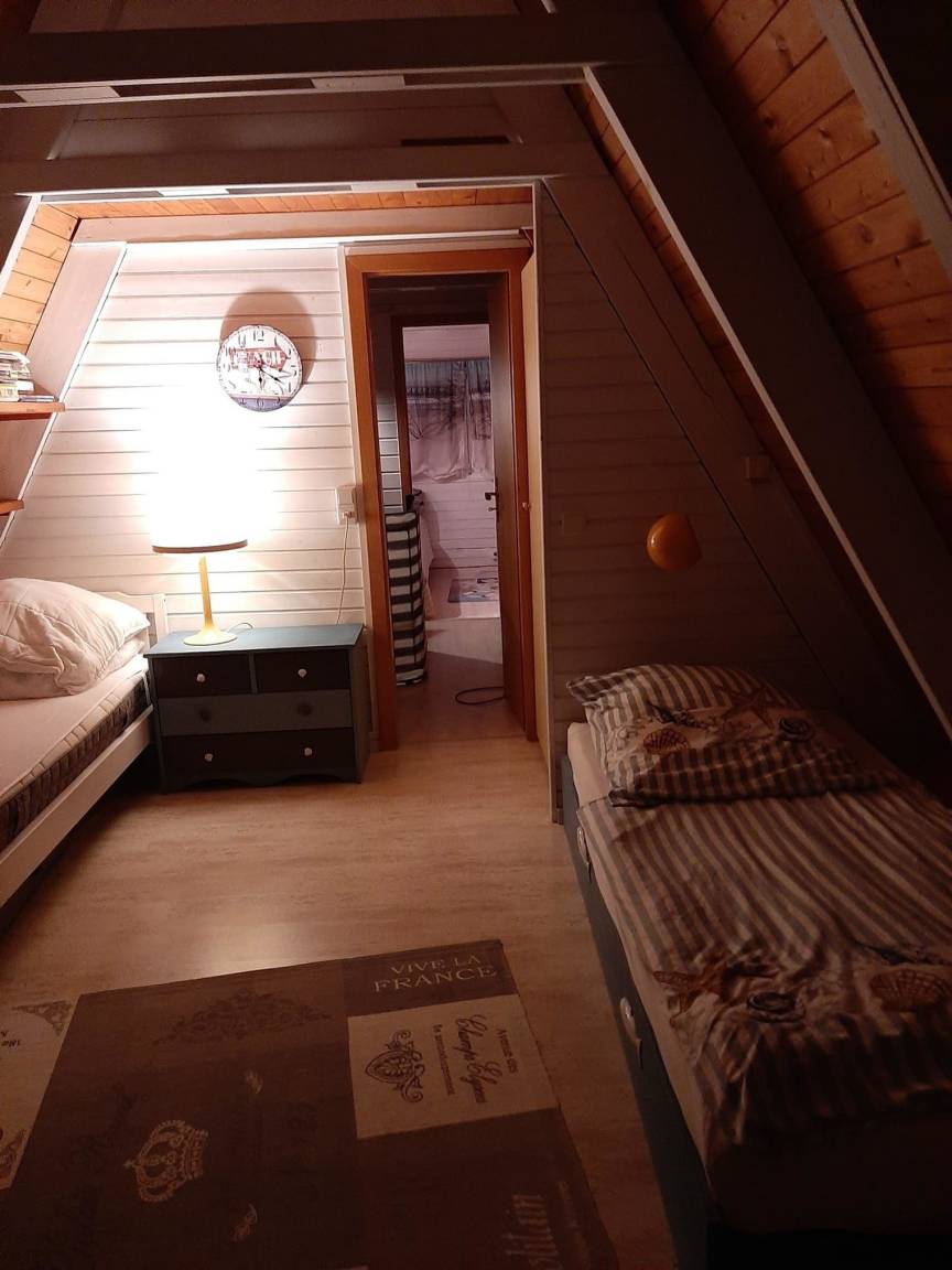 Die Küche ist modern und voll ausgestattet. Das Bad hat eine ebenerdige Dusche mit Glasfalttüren und ist sehr geschmachvoll eingerichtet. Die beiden Schlafzimmer liegen im oberen Bereich. In dem große Schlafzimmer befinden sich 2 Einzelbetten und ein Schlafsofa mit Federkernmatratze. Es verfügt über einen zusätzlichen Fernseher mit DVD und Radio mit CD Player. Babyreisebett,Stuhl und Tisch sind in dieser Unterkunft enthalten. Diverse Spiele, Malstifte,Bücher, DVDs, Gartenspiele können und sollen genutzt werden.