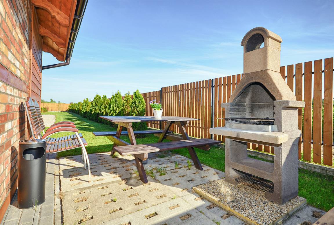Haus: Schöne, gepflegte Ferienhausanlage auf einem umzäunten Grundstück. 12 Komfortable Reihenhäuser, 2016 neu erbaut, mit geschmackvoller, moderner Einrichtung. Fußbodenheizung, E-Radiatoren. Warmwasser über E-Boiler (80 l). Terrasse, teilweise überdacht, davor kleiner Garten mit Rasenfläche. In der Anlage: Rezeption, Kinderspielplatz mit Sandkasten, Rutschen, Schaukeln, Trampolin, Fußballfeld. Überdachte Außenküche mit Grills zur gemeinschaftlichen Nutzung. Kostenloses Internet über WLan (LTE). Parken auf dem umzäunten Grundstück.