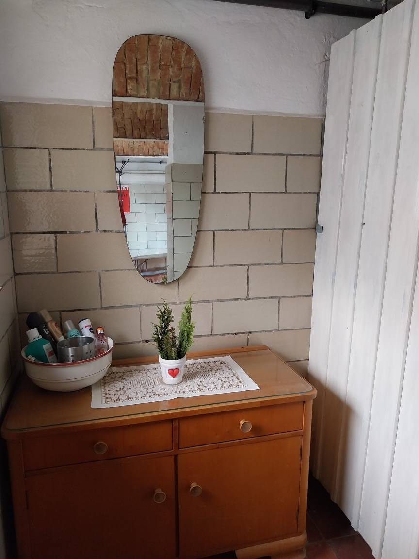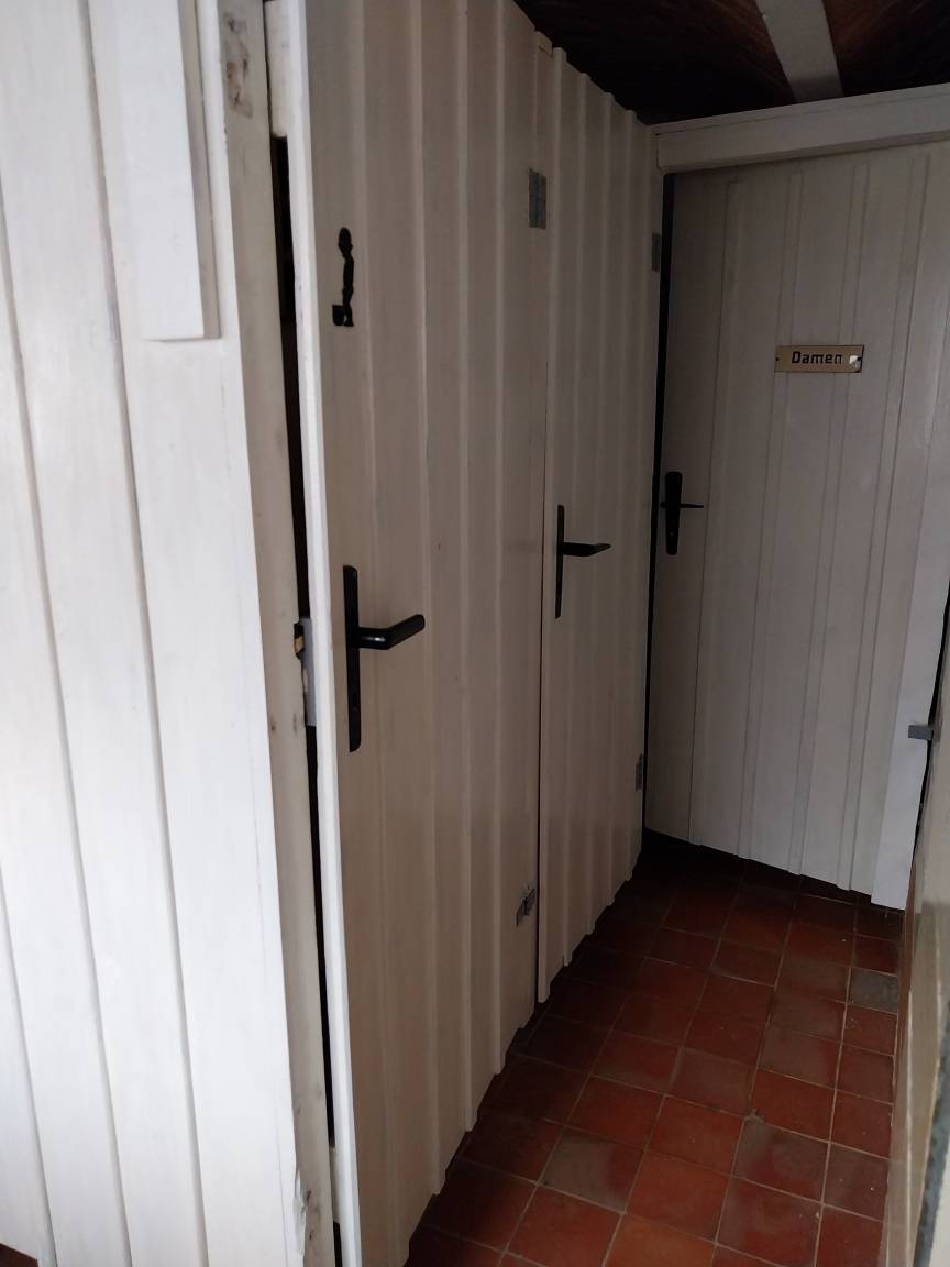 Die Dusche und das WC befinden sich auf unserem Hofgelände. Dies ist ca. 150 m vom Wohnwagen entfernt.
