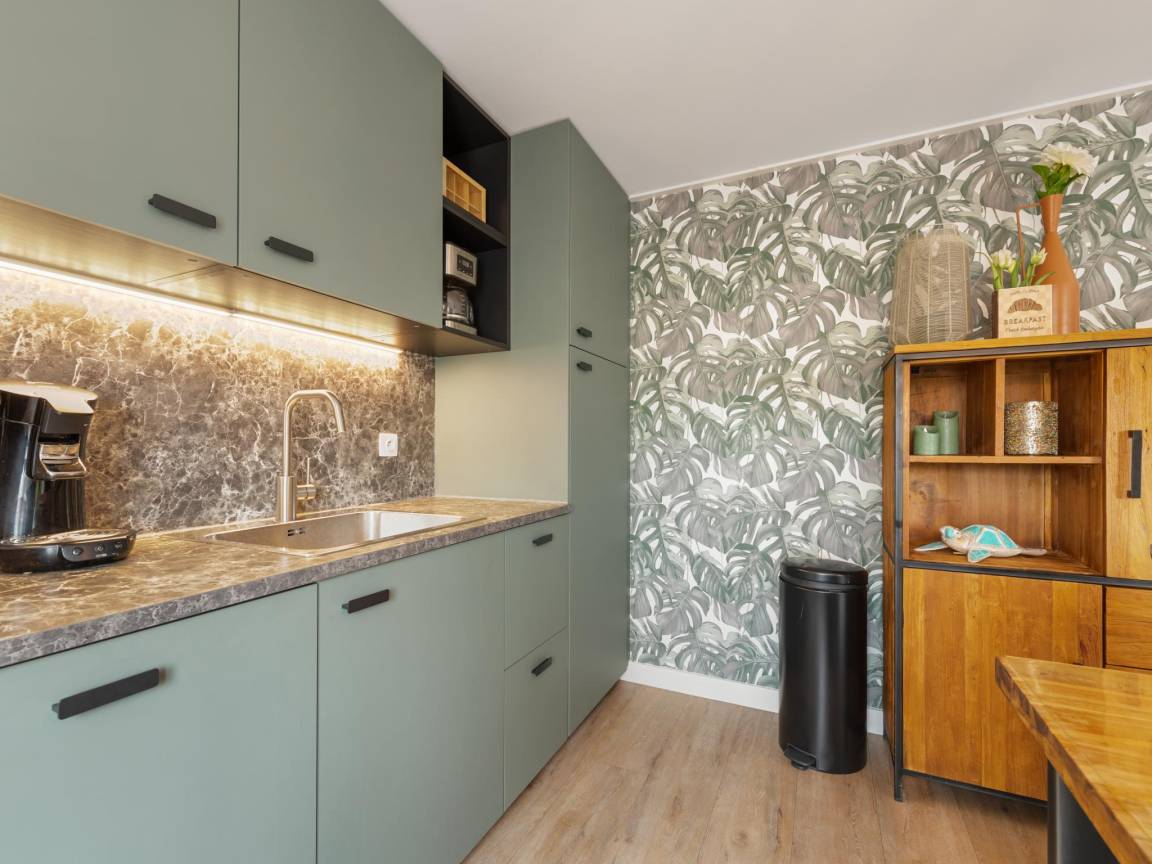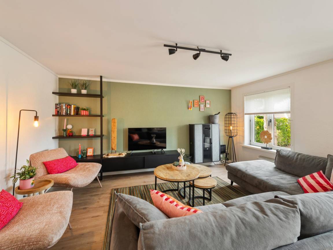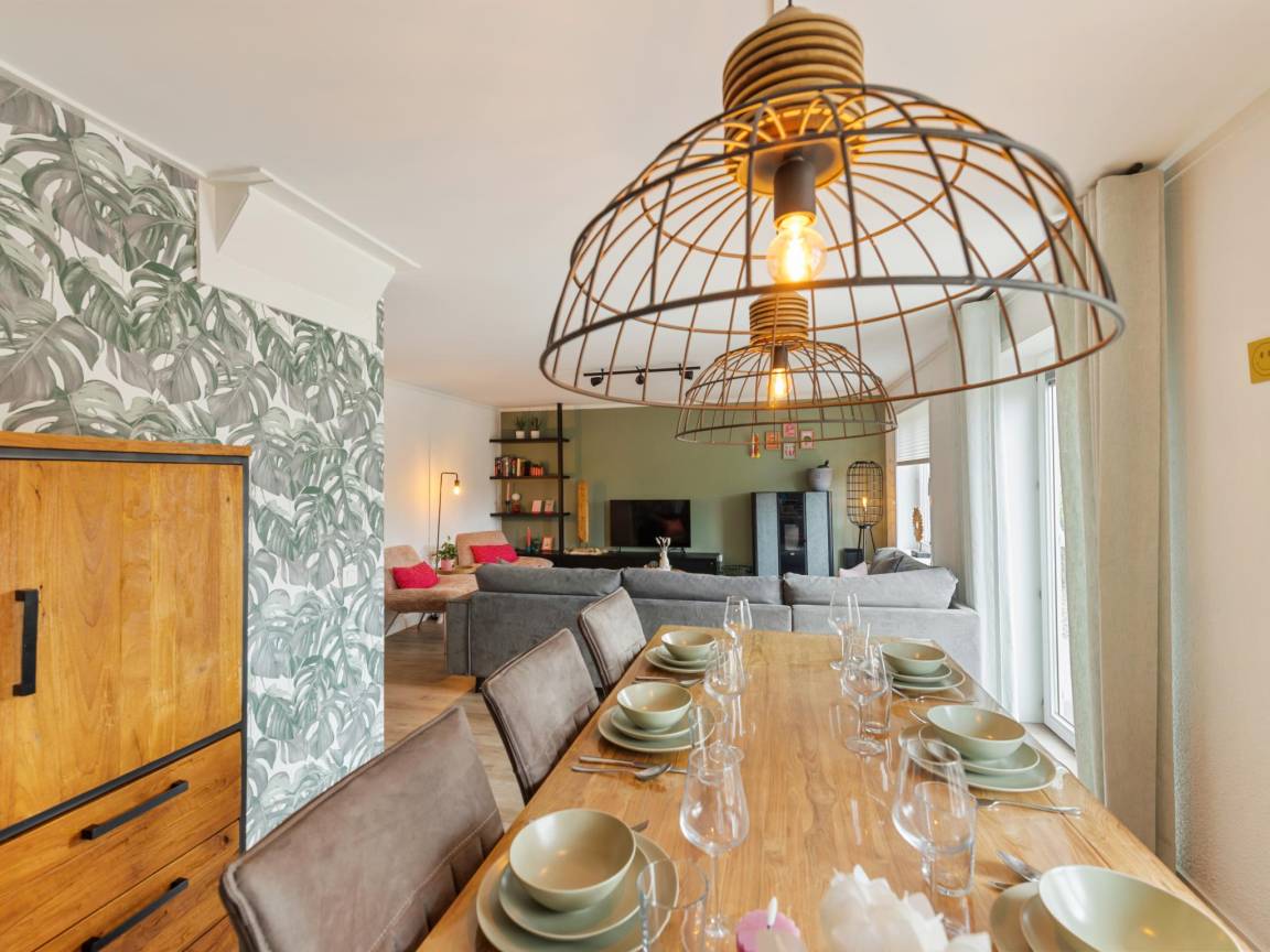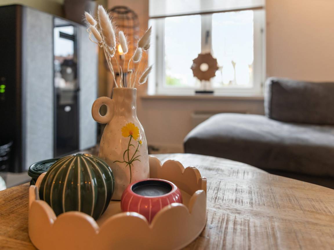 Layout : Parterre: Wohnzimmer mit TV(Flatscreen, smart TV), Ofen(Pellet-Holzofen ), Sitzecke , offene Küche mit Esstisch, Kochplatte(4 Kochplatten, elektrisch), Wasserkocher, Dunstabzugshaube, Kaffeemaschine(senseo pads), Kombi-Mikrowelle, Geschirrspüler, Kühlschrank(+ Gefrierfach) , Schlafzimmer mit Doppelbett(Boxspring, 180 x 200 cm) , Badezimmer mit Dusche(ebenerdige Dusche), Waschbecken , Toilette mit Toilette , Staubsauger, 1x Hochstuhl, Bügelbrett, Bügeleisen, Gesellschaftsspiele
