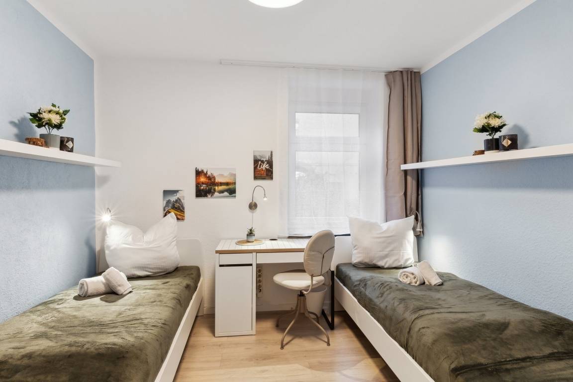 In unserer zentralen großen Wohnung finden bis zu 6 Personen Platz zum Übernachten im schönen Delitzsch. Im Winter warm dank Fußbodenheizung, im Sommer angenehm durch die Lage im Erdgeschoss. Jeder Schlafraum verfügt über zwei Einzelbetten mit EmmaOne Matratzen, viel Stauraum und einen Arbeitsplatz. Für eine gemeinsame schöne Zeit gibt es, neben dem Essbereich in der voll ausgestatteten Küche, eine Sitzecke mit Smart-TV. Im Bad gibt es neben Dusche und Wanne eine Waschmaschine +Waschtrockner.