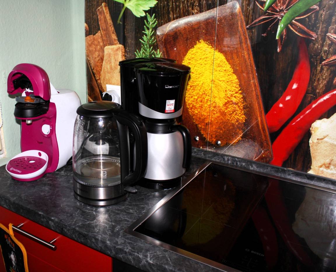 Ihnen stehen neben einem Kühlschrank auch eine Kaffeemaschine und eine Mikrowelle zur Verfügung.