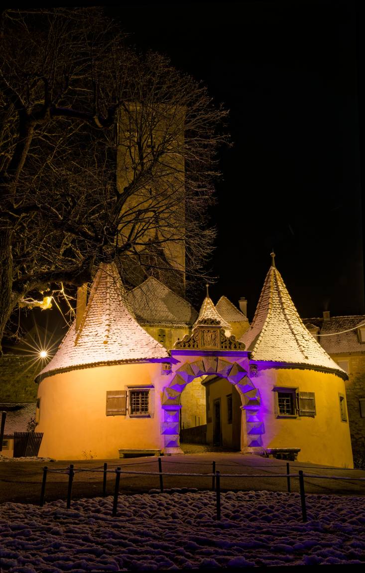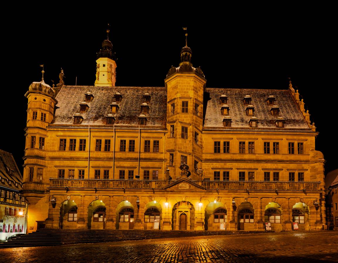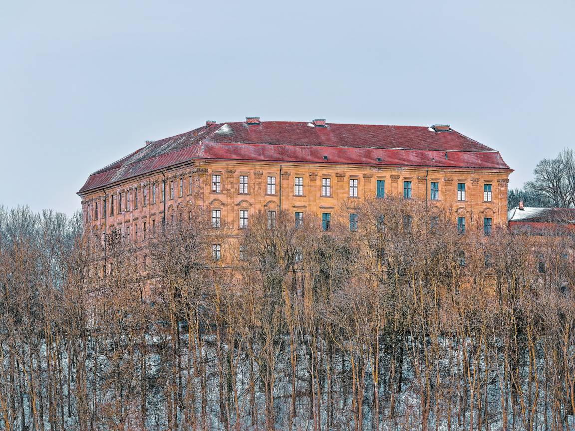 Der rund 10 m² große Balkon bietet einen atemberaubenden Ausblick auf das nächtlich beleuchtete Barockschloss der Fürsten zu Hohenlohe Schillingsfürst.