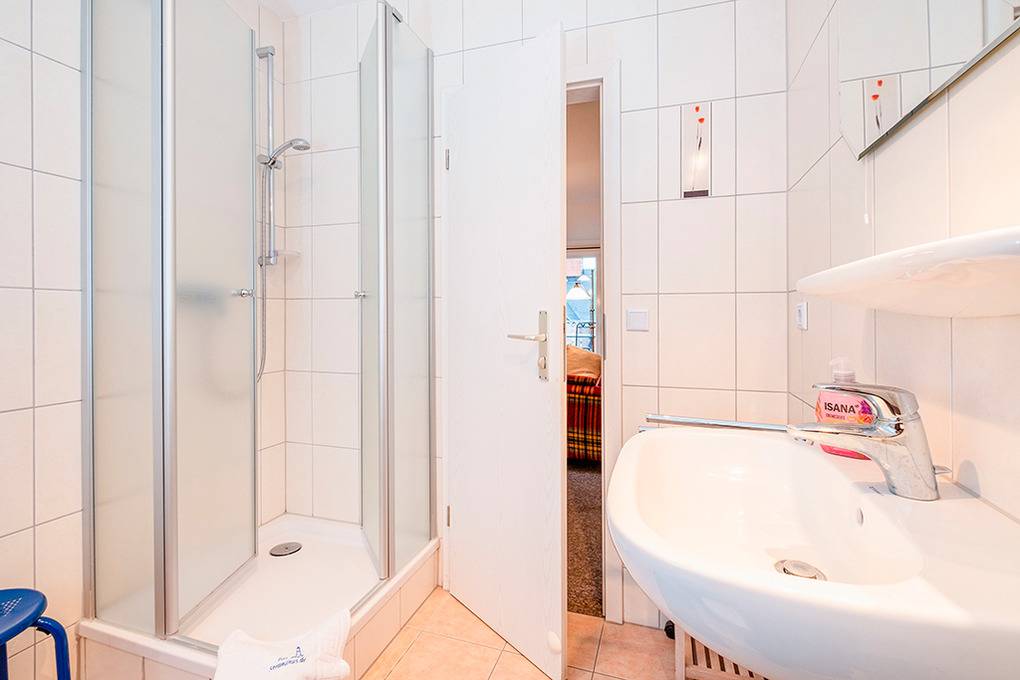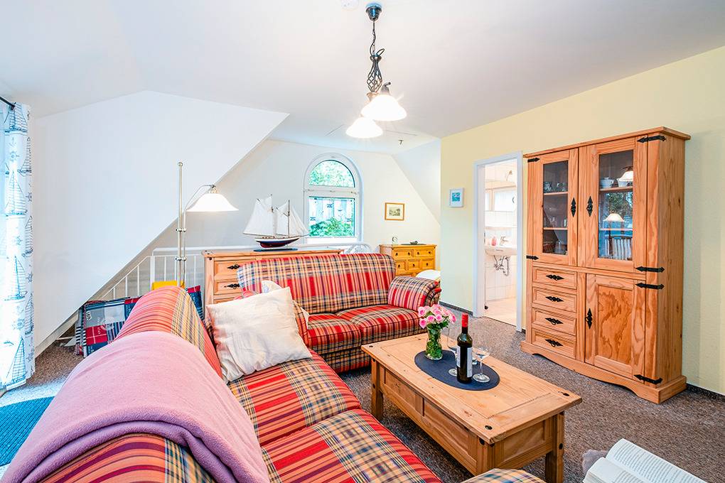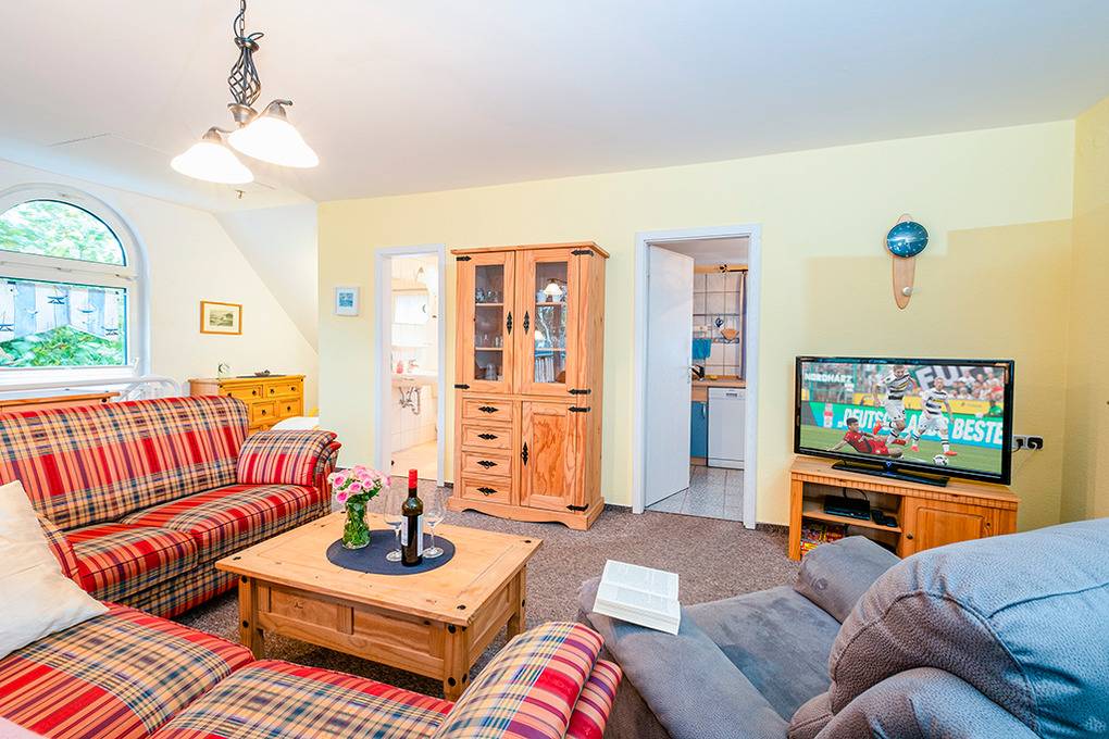 D 63.13 Wohnung 1-3 Pers.: 3 ½-Zimmerwohnung mit 45 qm Wohnfläche, 1. Etage. Großzügiger Wohnraum mit gemütlicher Couchgarnitur, Flachbild-Sat-TV, DVD-Player. Separate Küche mit Esstisch, gut ausgestatteter Küchenzeile (Backofen, Spülmaschine). Doppelzimmer. Einzelzimmer. Bad/WC. Separate Sitzecke auf Terrasse am Haus.