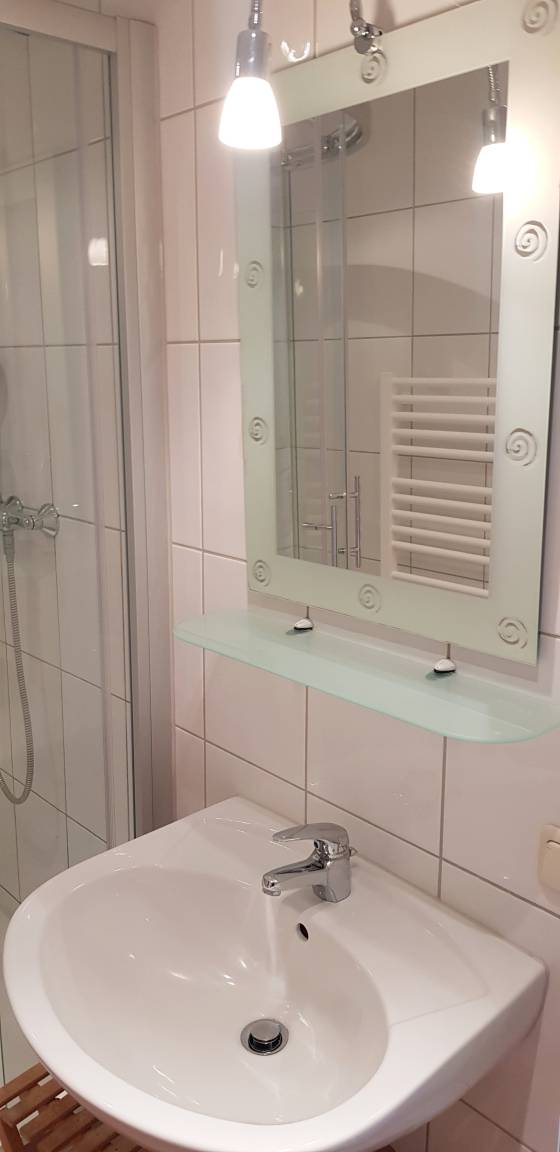 Das modern eingerichtete Bad verfügt über eine Dusche.