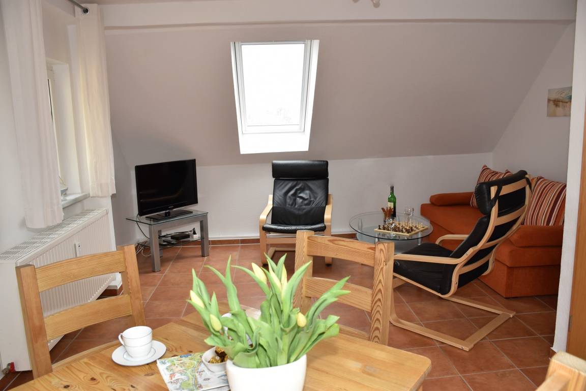 - Wohnzimmer mit Schlafcouch (Breite 1,40 m) und Essbereich, Fernseher und Radio