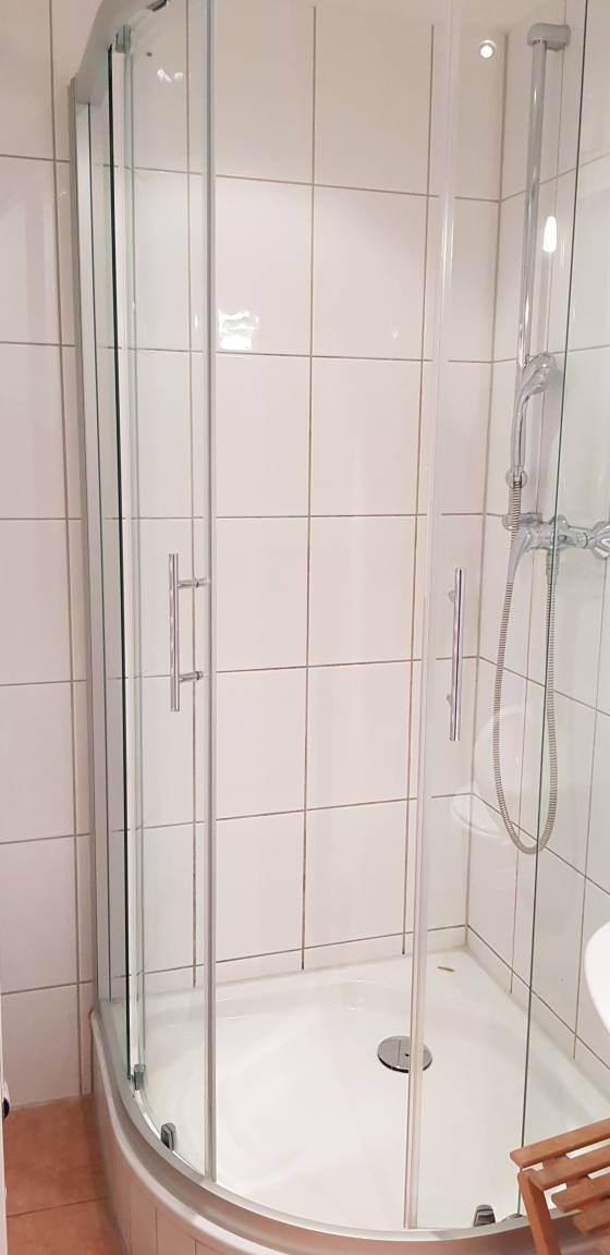 Das modern eingerichtete Bad verfügt über eine Dusche.