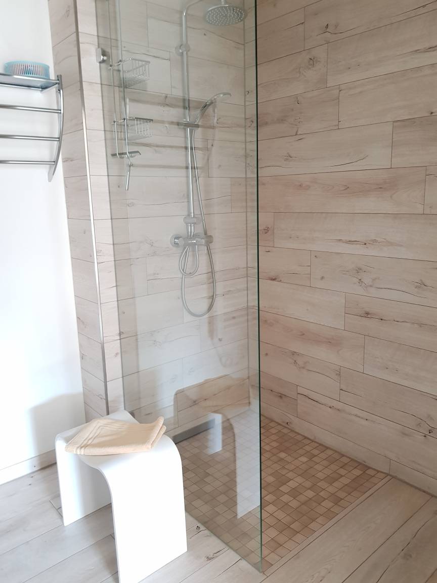 - ein Badezimmer mit großer bodengleicher Eckdusche, Fön und Kosmetikspiegel