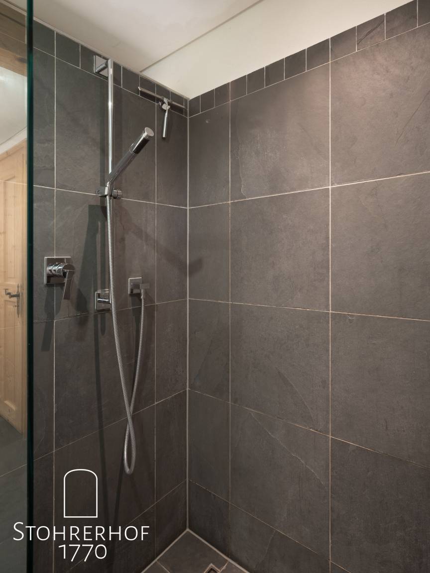 Die ehemalige Kammer (13 qm) des Gutshofes ist unser drittes kuscheliges Schlafzimmer mit einem bequemen Doppelbett (1,80 x 2,00). Dieses grenzt ebenfalls an das geschmackvolle Bad (8 qm) mit Fußbodenheizung und Handtuchtrockner, welches mit hochwertigstem kanadischem grünen Schiefer gefliest ist, an.