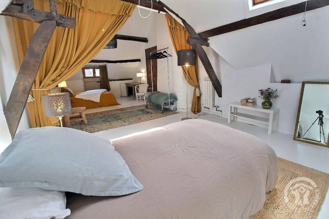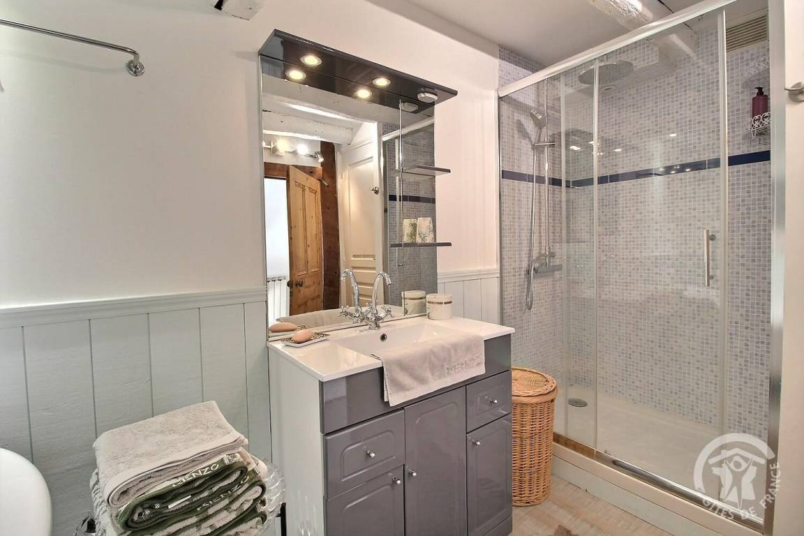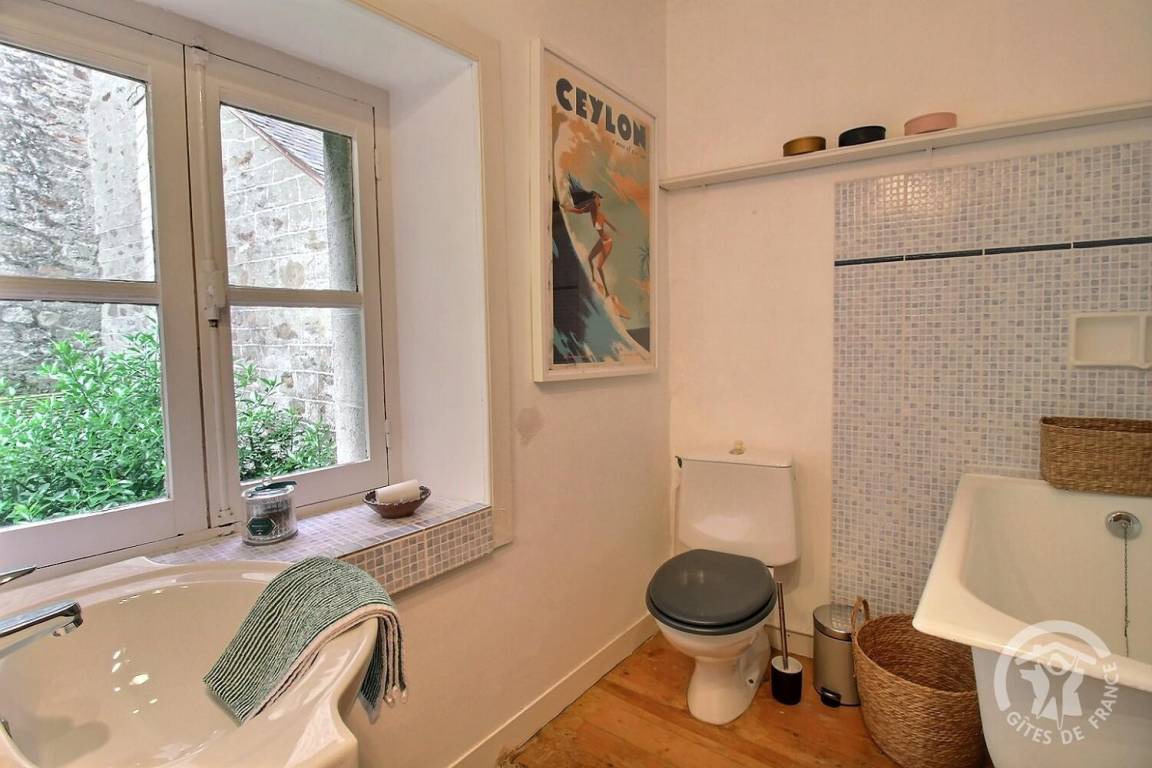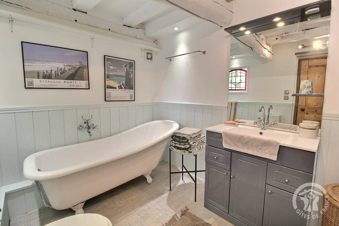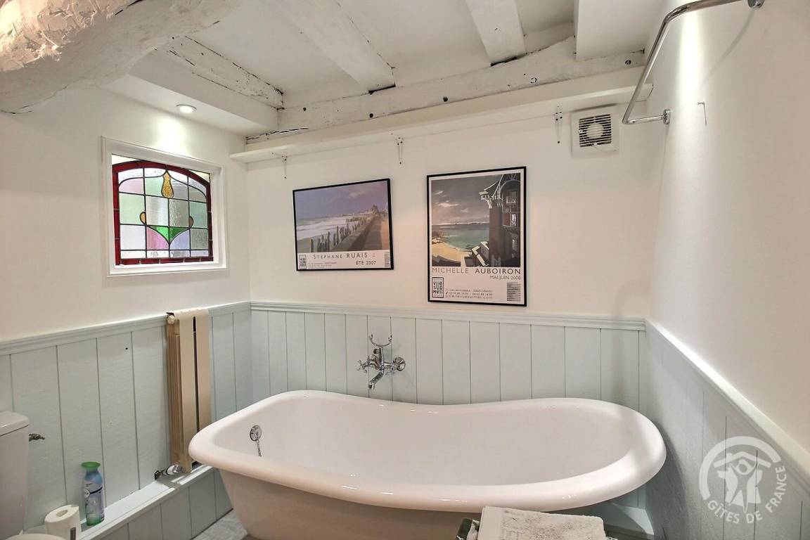- Im zweiten Stock: ein Schlafzimmer (ein 140x190-Bett) mit eigenem Badezimmer (Dusche, Badewanne und Toilette), ein zweites Badezimmer (Sitzbadewanne und Toilette)
