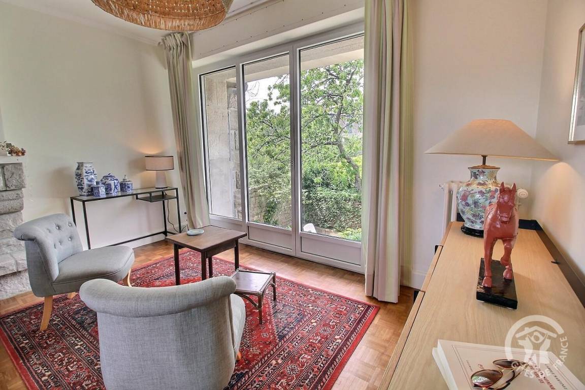 Das durch seine Erkerfenster helle Wohnzimmer öffnet sich zu einer perfekt integrierten modernen Küche.
