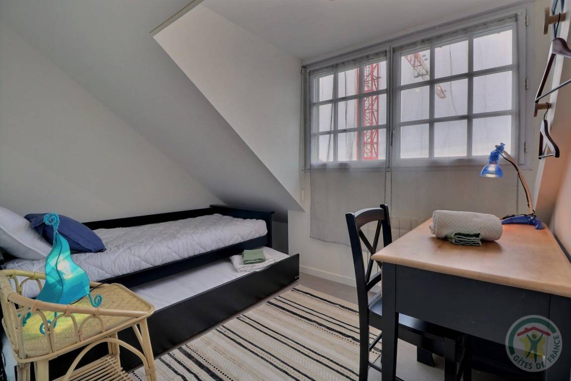 Dieses Apartment im 3. Stock verfügt über ein Wohnzimmer mit Schlafsofa, ein Wohnzimmer, einen voll ausgestatteten Küchenbereich, ein Schlafzimmer mit 1 Bett 140 x 200, 1 Schlafzimmer mit 2 Betten 90 x 190, darunter 1 Ausziehbett, ein Duschbad und ein WC. Elektroheizung. Gemeinsamer Waschraum mit Waschmaschine und Trockner sowie Fahrradkeller. Kostenlose Parkplätze an der Straße.