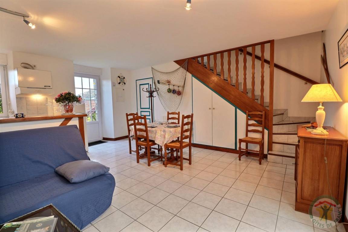 Im EG: Wohnbereich Esszimmer/Wohnzimmer zur Terrasse hin offen - Einbauküche - WC mit Handwaschbecken. Stockwerk: 1 Schlafzimmer mit 1 Doppelbett (160x200) - 1 Schlafzimmer mit 2 Einzelbetten - Bad mit Dusche - WC. Elektrische Zentralheizung. Innenraum Dekor und Ambiente rund um das Thema 'Meer'.