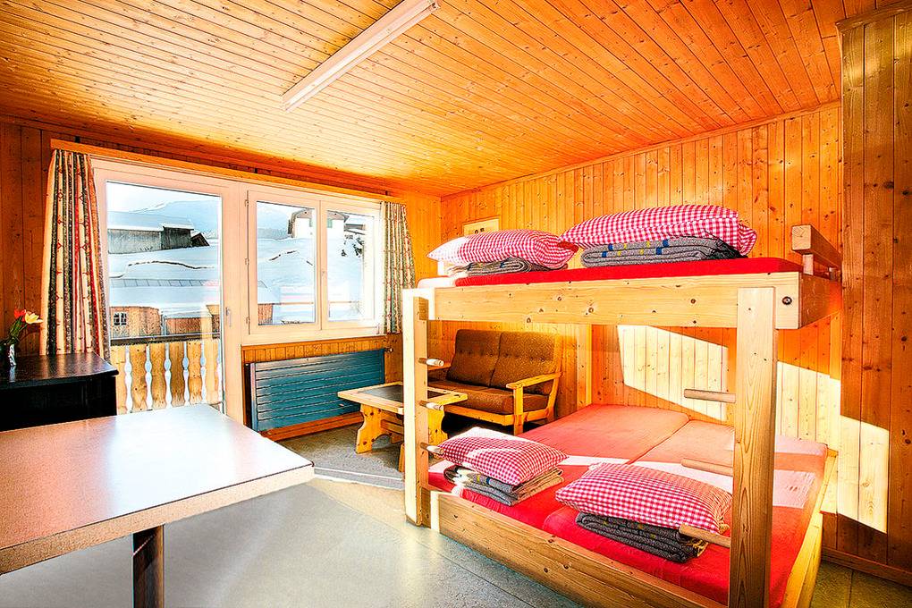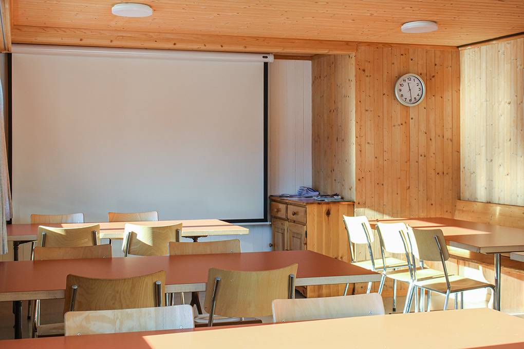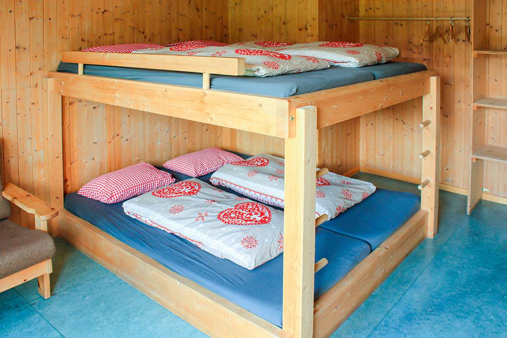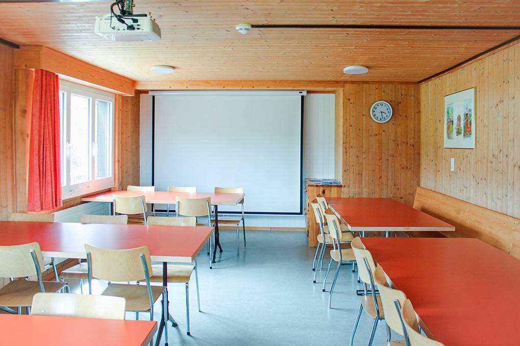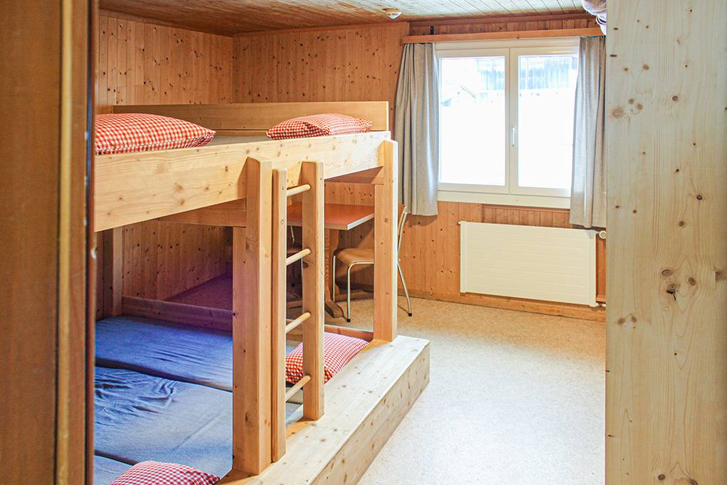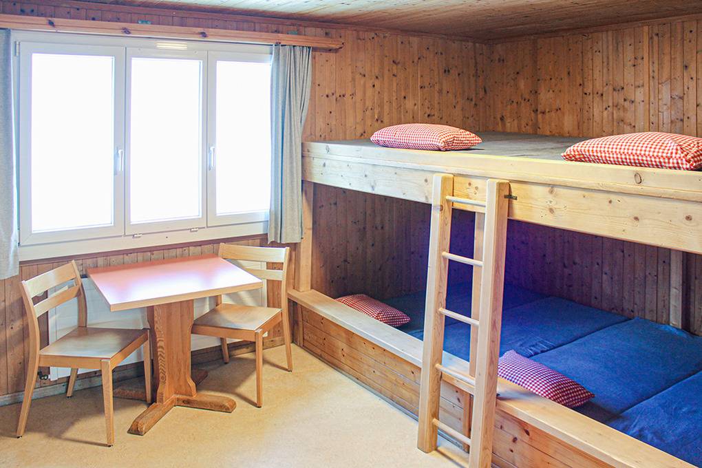 1. Etage: Freundlicher, holzvertäfelter Tagesraum mit herrlicher Aussicht, Beamer, Bluetooth-Lautsprechern. Zwei Schlafräume für 4/10 Pers., Holzetagenlager. Waschraum: 3 Duschen, 2 Waschrinnen (8 Hähne). 1 Pissoir. 2 separate WC.