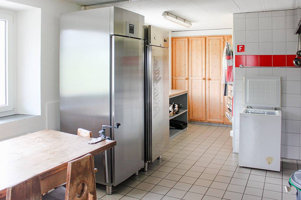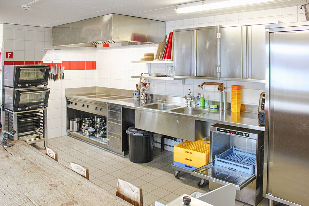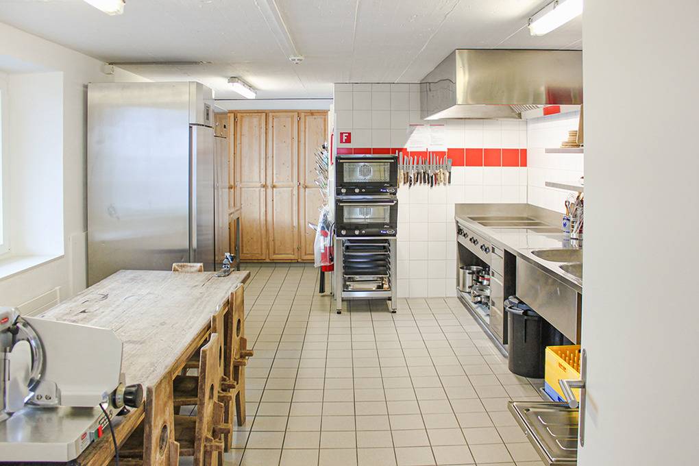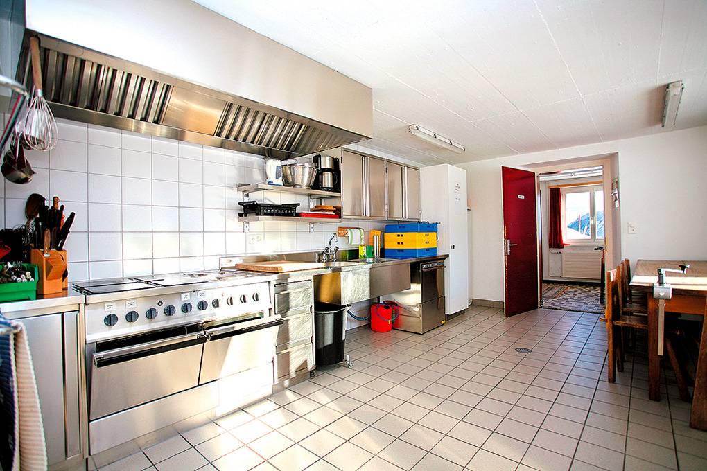 Parterre: Ski- und Skischuhraum. Gute Gruppenküche mit Spülmaschine.