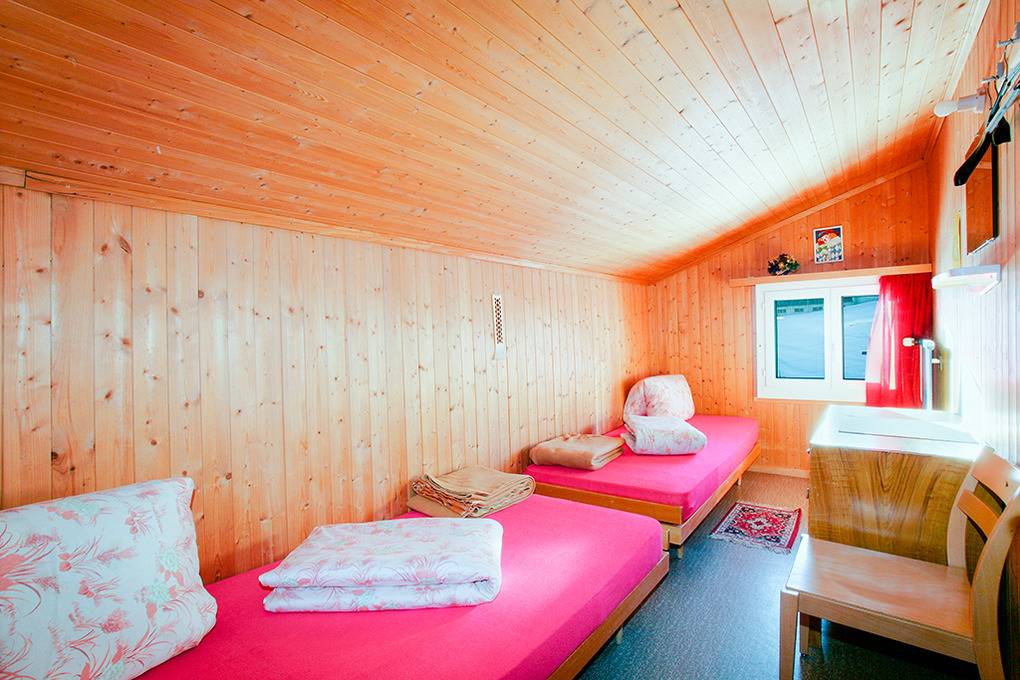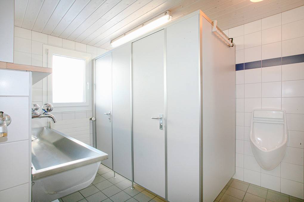 2. Etage: Ausgebautes Dachgeschoss mit Schrägen. 2-Bettzimmer. Drei Schlafräume für jeweils 8 Pers., Holzetagenlager, wenig Stauraum. Waschrinne (6 Hähne) in Flurnische. 1 Pissoir. 2 separate WC.