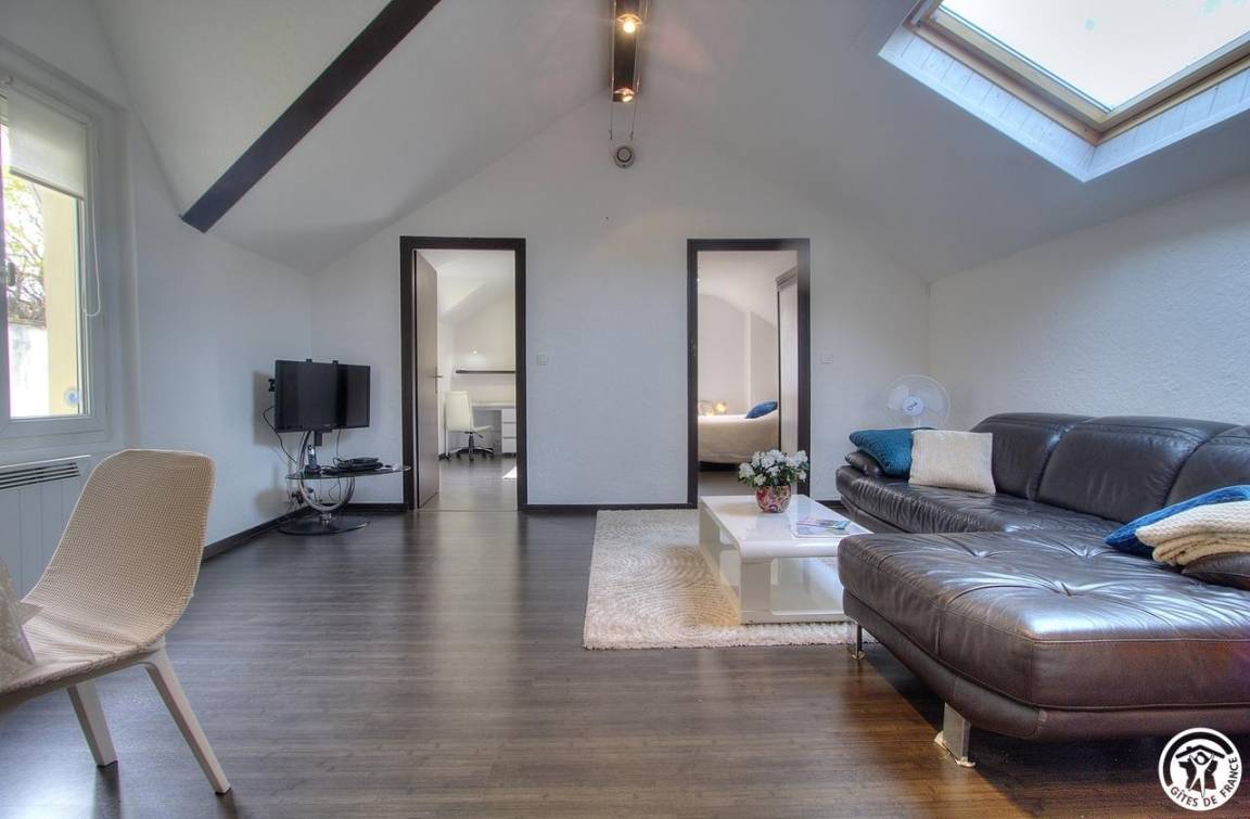Das Apartment „Lynx" verfügt über zwei Schlafzimmer und ein Büro und ist ideal für Geschäftsreisen oder Urlaubsaufenthalte. Die halboffene Küche geht in einen hellen Wohnbereich über, in dem ein Pelletofen für eine behagliche Atmosphäre sorgt. Die klare und moderne Einrichtung verstärkt das Gefühl von Weite und Ruhe mitten in der Stadt. Auch ohne privaten Außenbereich bietet das Apartment einen großen Vorteil: Sie befinden sich im Herzen von Divonne-les-Bains, direkt am See, dem Casino, den Thermalbädern, dem Golfplatz und den zahlreichen Sportanlagen und Wanderwegen rund um den Ort. Sportbegeisterte werden die Nähe zu Mountainbike-Strecken und Wanderw