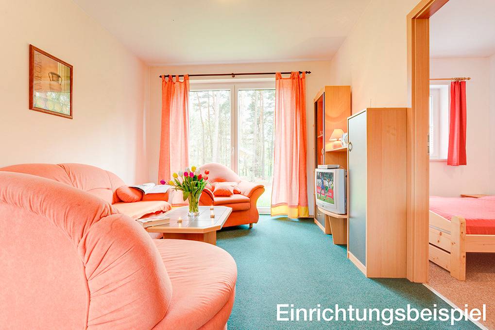 D 45.23 Ferienhäuser 2-6 Pers.: Schöne 3-Zimmerhäuser mit ca. 44 qm Wohnfläche, Parterre. Wohn-/Essraum mit Kaminofen, Couchgarnitur (Ausziehcouch 2 Pers.), Sat-TV, Radio/CD, Esstisch, Küchenzeile (Backofen). Doppelzimmer mit Kinderbett. 2 Bettzimmer. Bad/WC.