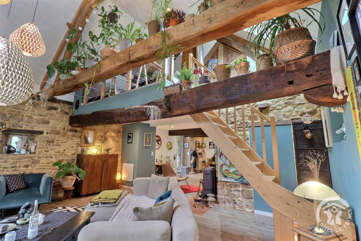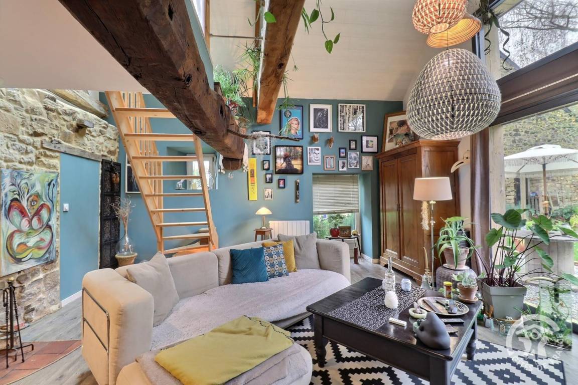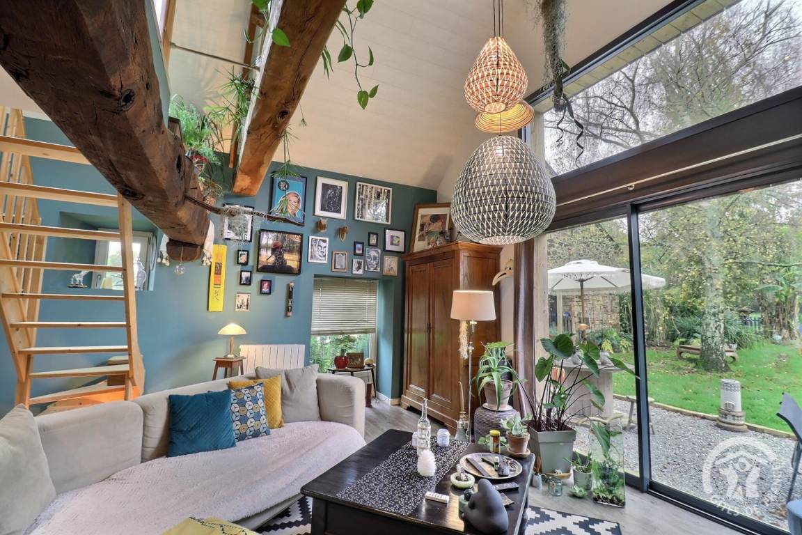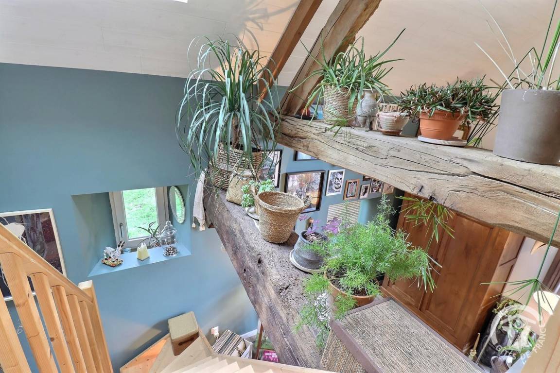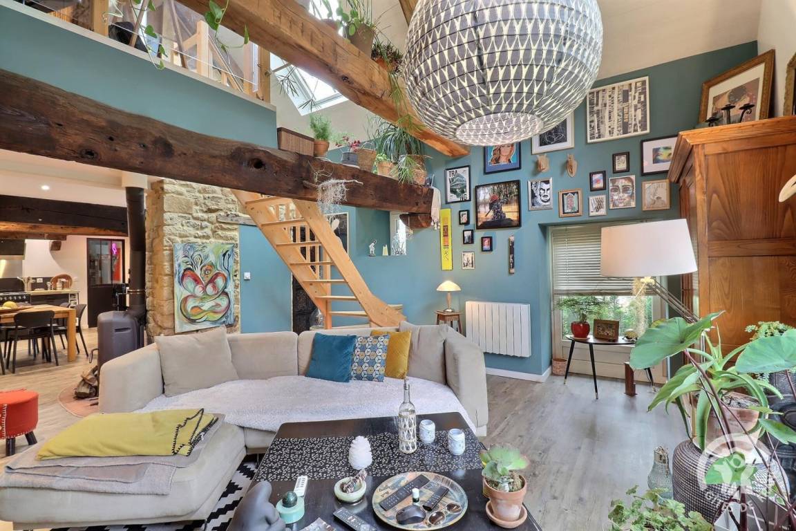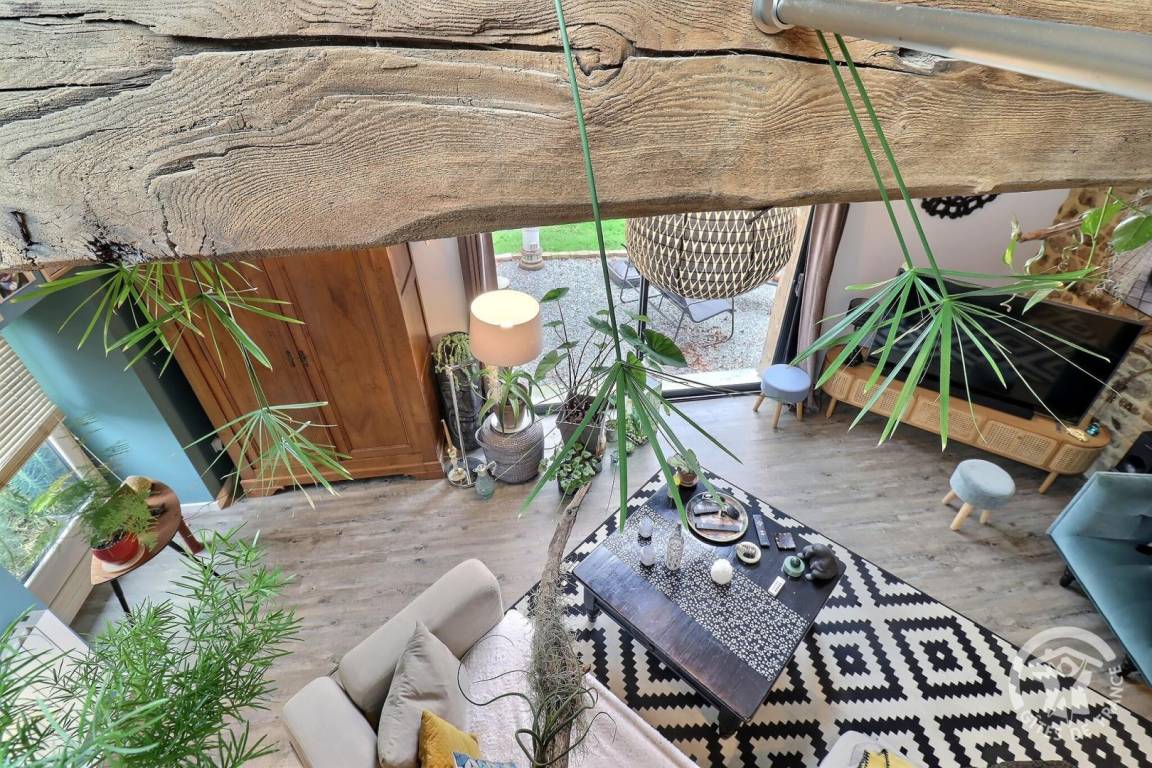 Das Innere dieses warmen Hauses kombiniert glücklich Stein und Holz und bietet eine sorgfältig recherchierte Dekoration, die vom Eigentümer mit Bedacht ausgewählt wurde. In diesem vielseitigen Universum gedeihen die Pflanzen im Zwischengeschoss dank der zahlreichen Lichtquellen im Wohnzimmer.