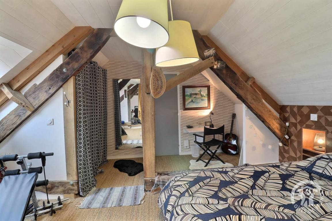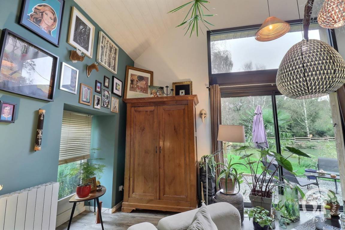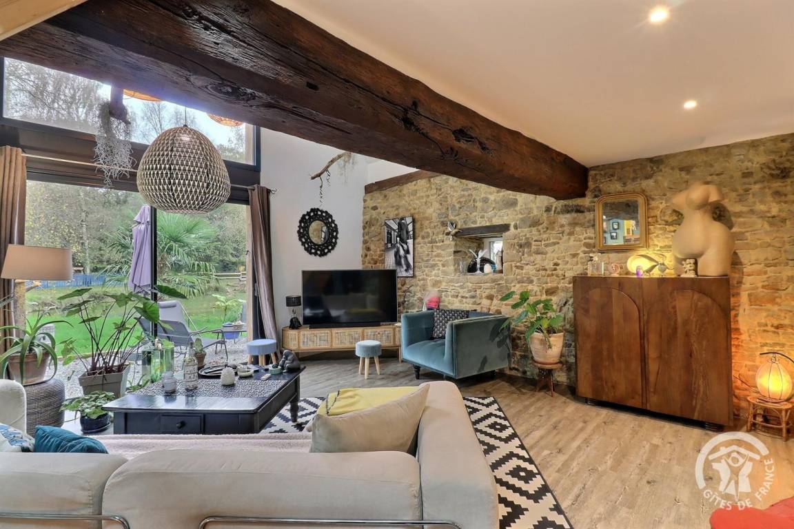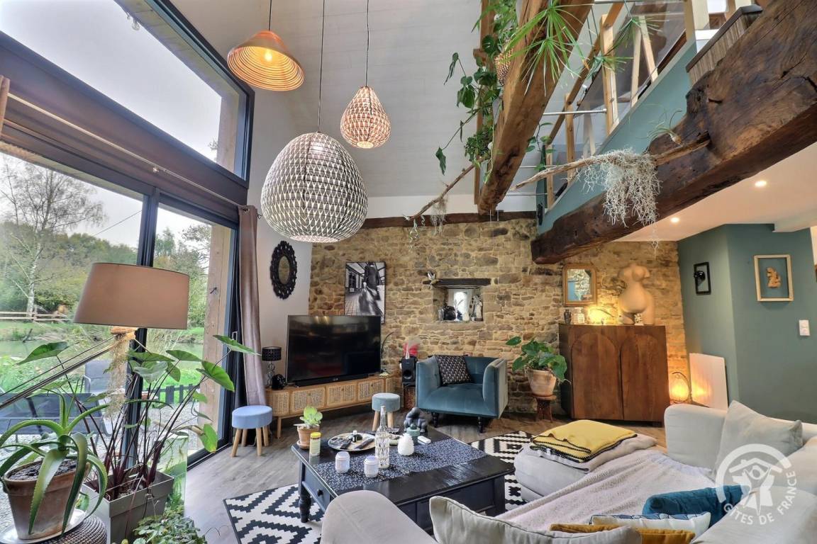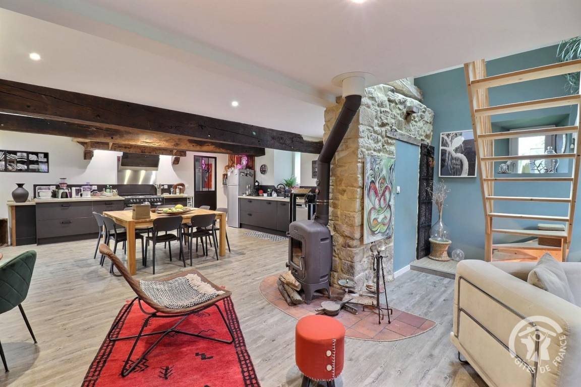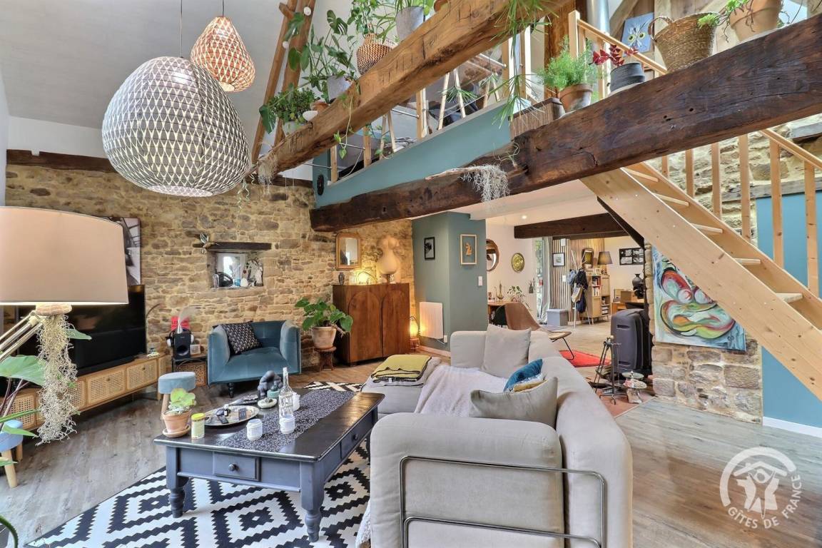 Das Innere dieses warmen Hauses kombiniert glücklich Stein und Holz und bietet eine sorgfältig recherchierte Dekoration, die vom Eigentümer mit Bedacht ausgewählt wurde. In diesem vielseitigen Universum gedeihen die Pflanzen im Zwischengeschoss dank der zahlreichen Lichtquellen im Wohnzimmer.
