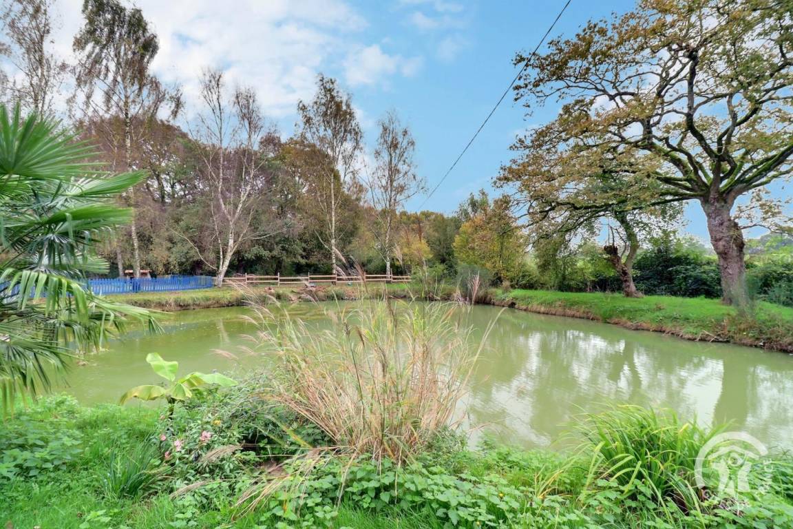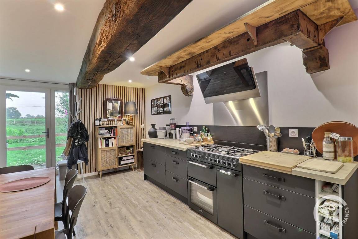 - ein großes Wohnzimmer mit Einbauküche und Esstisch, Holzofen und großem Wohnzimmer mit Blick auf einen privaten Teich