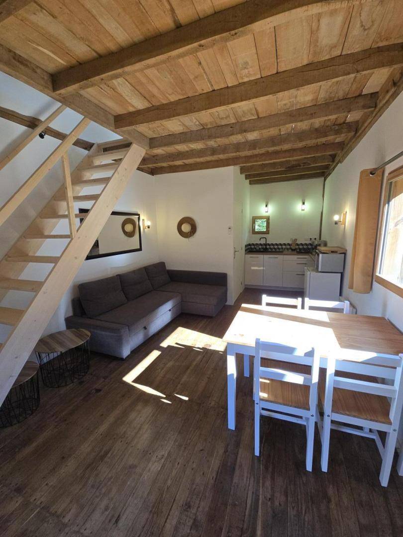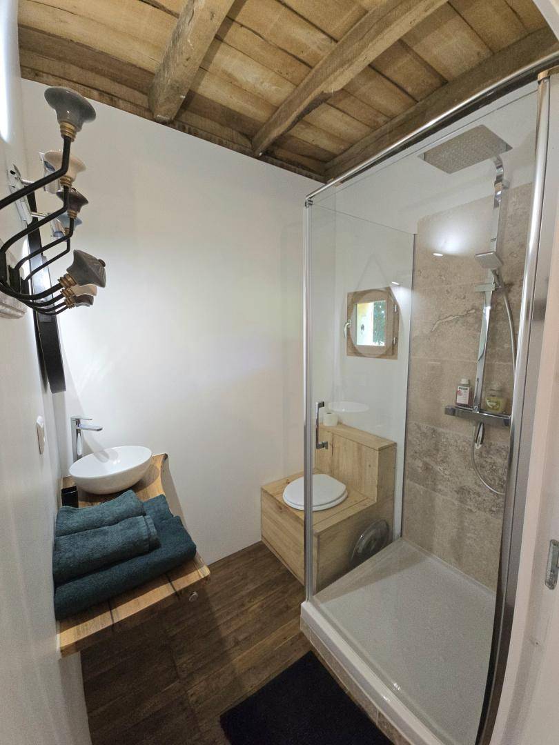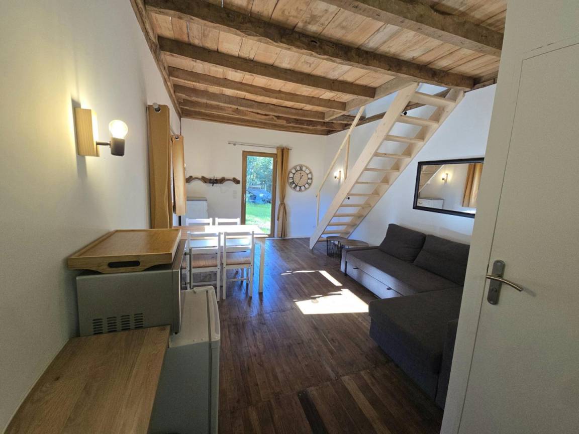 Dieses Haus liegt 50 Meter vom Haus der Eigentümer entfernt in einem bewaldeten Park neben dem Gehege von zwei Ziegen und drei Schafen. Das Holzchalet verfügt über einen Hauptraum mit kleinem Kühlschrank, Mikrowelle mit Grillfunktion, Espressomaschine, Gasherd mit zwei Kochstellen, Toaster und Spüle. Ein Essbereich mit Tisch und vier Stühlen ist ebenfalls vorhanden. Auf Wunsch kann ein Ecksofa in ein 140 x 200 cm großes Bett umgewandelt werden. Das Badezimmer ist mit einer ebenerdigen Dusche und einem WC ausgestattet. Im Obergeschoss befindet sich eine Galerie mit einem 160 x 200 cm großen Bett, einem Schreibtisch und einer Klimaanlage. Ein privater Aufstellpool steht im Juli und August zur Verfügung. Parkplätze sind auf dem Grundstück vorhanden. Eine optionale „Greenup"-Ladestation für Elektrofahrzeuge mit Unterzähler ist zum Preis von 0,25 €/kWh verfügbar.