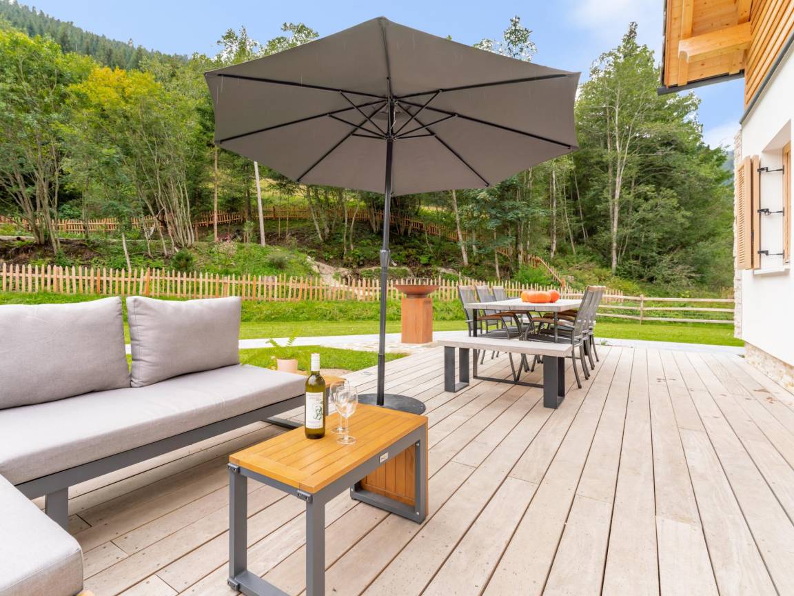eine sonnige Südterrasse. Im Inneren finden Sie ein geräumiges Wohnzimmer mit Pelletofen, eine moderne, offene Küche und eine Kinderecke. Genießen Sie im Sommer die Österreichische Sonne auf den bequemen Liegestühlen oder Lounge im eingezäunten Garten, wo es auch eine Plancha BBQ gibt