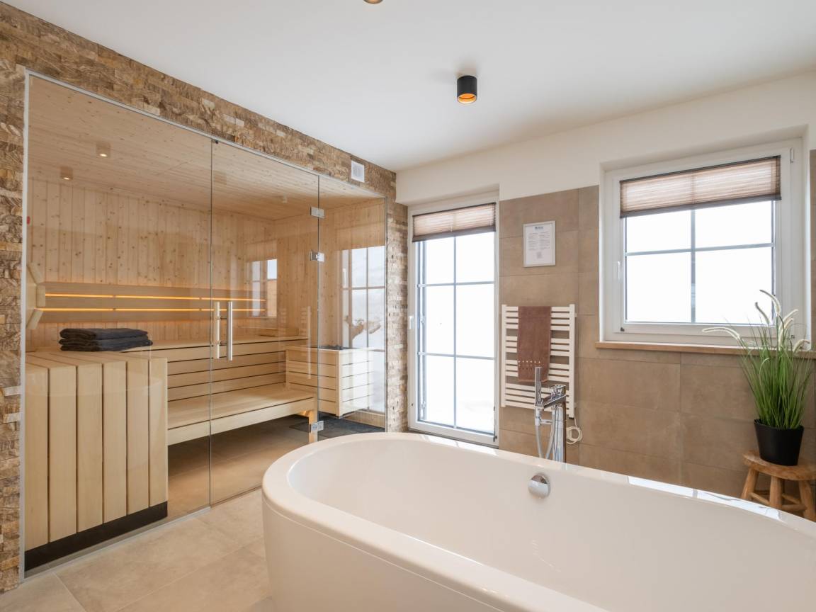 Layout : Parterre: Eingang mit Toilette , Wohnzimmer mit TV(smart TV), Esstisch, Dekokamin, Sitzecke , offene Küche mit Wasserkocher, Toaster, Kochherd(Induktion), Kaffeemaschine(Filter, nespresso cups), Backofen, Mikrowelle, Geschirrspüler, Kühl-/Gefrierkombination , Badezimmer mit Badewanne mit Dusche, Sauna , Wäschetrockner, Waschmaschine, Liegestühle