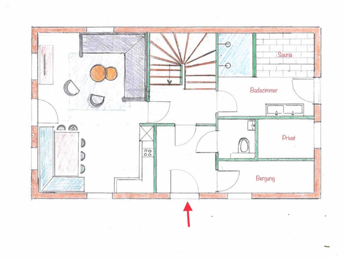 Layout : Parterre: Eingang mit Toilette , Wohnzimmer mit TV, Esstisch, Sitzecke, kabelloses Musiksystem , offene Küche mit Toaster, Kochherd(4 Kochplatten, Induktion), Kaffeemaschine(pads), Backofen, Mikrowelle, Geschirrspüler, Kühl-/Gefrierkombination , Badezimmer mit 2x Dusche(ebenerdige Dusche), Sauna, 2x Waschbecken, Heizung(Fußbodenheizung) , Abstellraum mit Wäschetrockner, Waschmaschine, Skischuhheizung