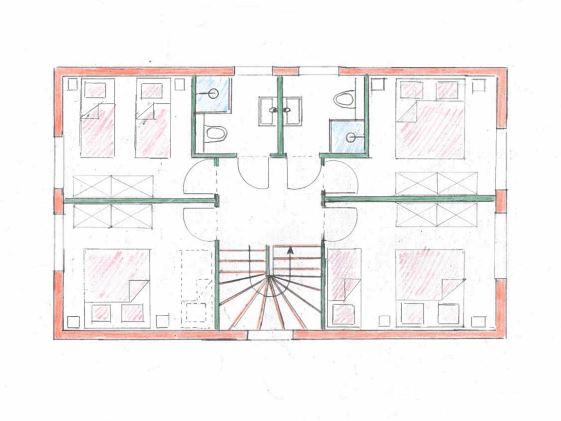 In der 1. Etage: Schlafzimmer mit Einzelbett(90 x 200 cm), Doppelbett(180 x 200 cm) , Schlafzimmer mit 2x Einzelbett(90 x 200 cm) , Schlafzimmer mit Einzelklappbett (80 x 200 cm), Doppelbett(180 x 200 cm) , Schlafzimmer mit Doppelbett , Badezimmer mit Dusche(Regen), Waschbecken, Toilette, Heizung(Fußbodenheizung) , Badezimmer mit Dusche(Regen), Waschbecken, Toilette, Heizung(Fußbodenheizung)