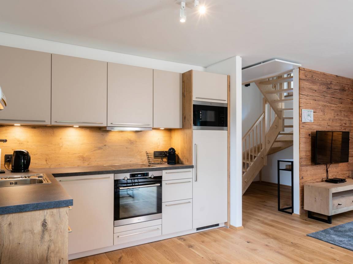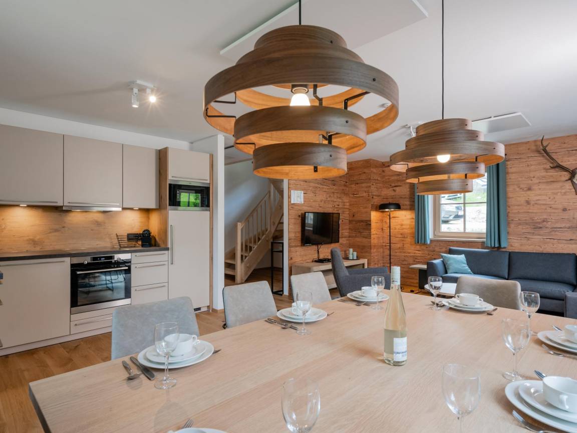 Layout : Parterre: Eingang mit Toilette , Wohnzimmer mit TV(smart TV), Esstisch(10 Personen), Sitzecke , offene Küche mit Wasserkocher, Toaster, Kochherd(4 Kochplatten, Induktion), Kaffeemaschine(cups, Filter), Backofen, Mikrowelle, Geschirrspüler, Kühl-/Gefrierkombination, Stabmixer , Badezimmer(Fußbodenheizung) mit Dusche, Sauna, 2x Waschbecken, Föhn , Abstellraum mit Wäschetrockner, Waschmaschine, Skischuhheizung, Bügelbrett, Bügeleisen