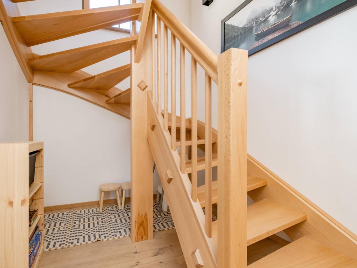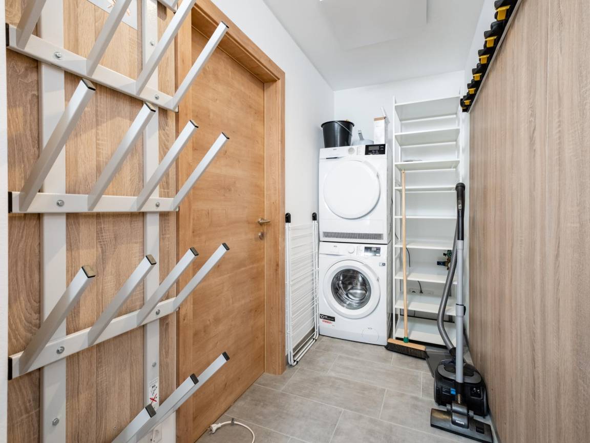 Layout : Parterre: Eingang mit Toilette , Wohnzimmer mit TV, Esstisch, Sitzecke , offene Küche mit Wasserkocher, Toaster, Kochherd(4 Kochplatten, Induktion), Kaffeemaschine(cups, Filter), Backofen, Mikrowelle, Geschirrspüler, Kühl-/Gefrierkombination , Badezimmer(Fußbodenheizung) mit Dusche, Sauna, 2x Waschbecken , Abstellraum mit Wäschetrockner, Waschmaschine, Skischuhheizung