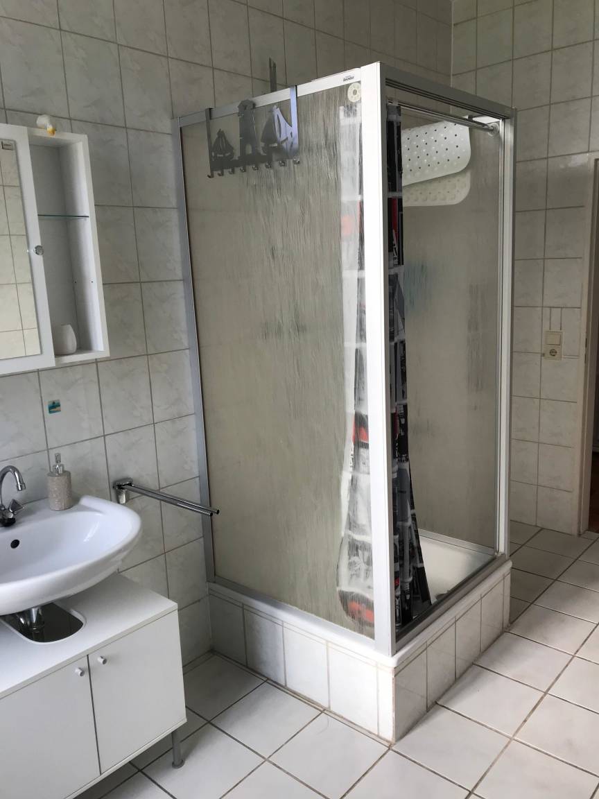 Das Badezimmer ist mit einer Dusche ausgestattet.