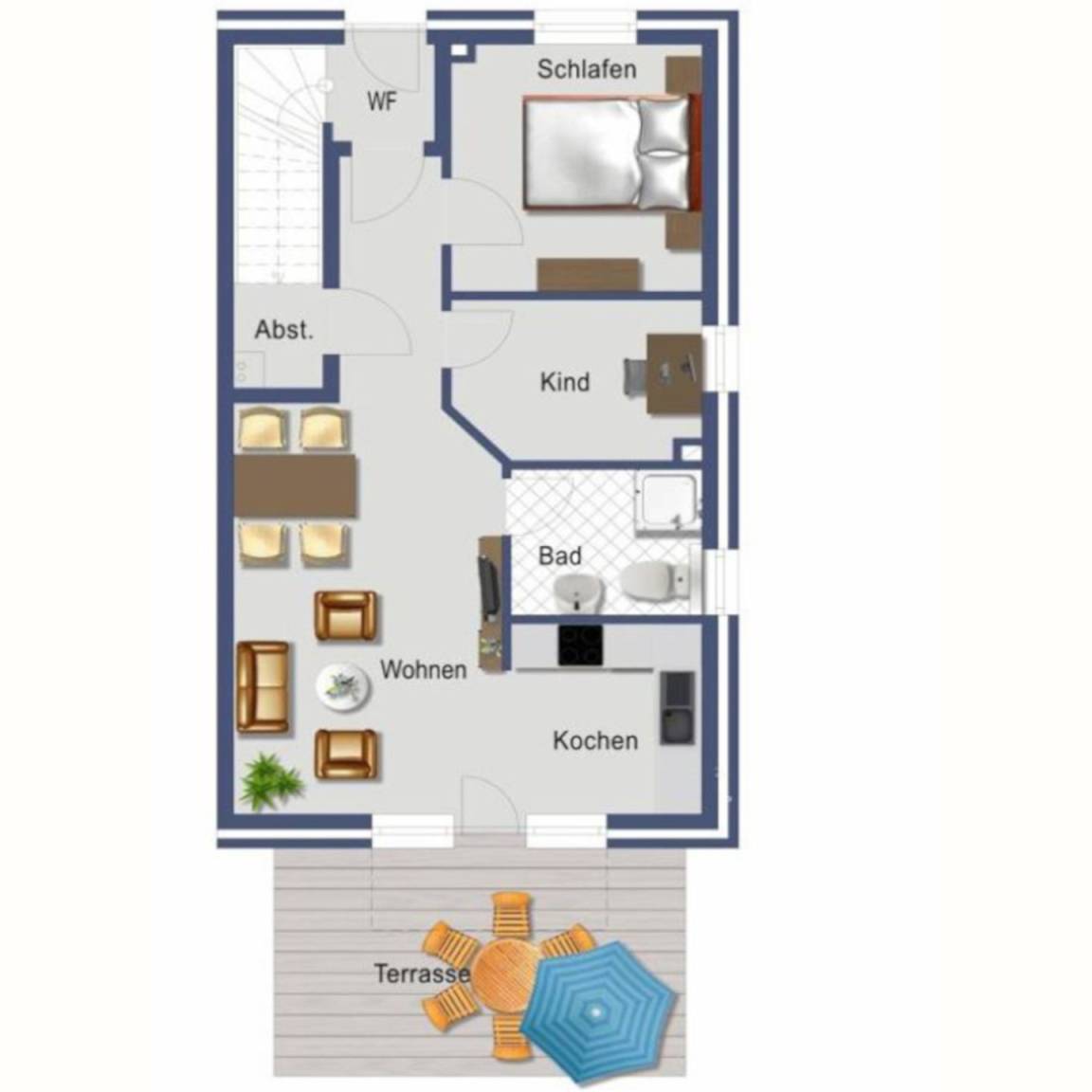 Auf 60 m² finden Sie einen hochwertig eingerichteten Wohn / Essbereich mit einer gut ausgestatteten Küche, sowie ein modernes Badezimmer mit ebenerdiger Dusche.