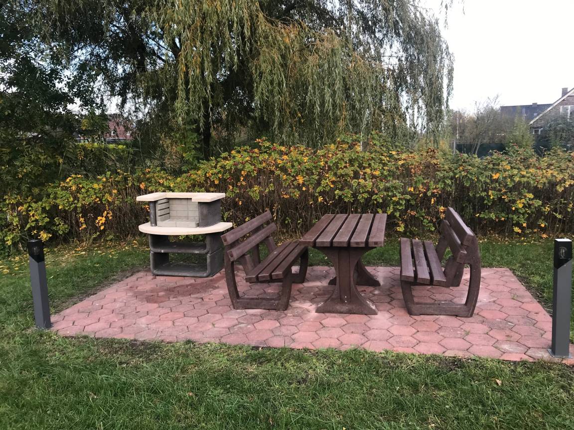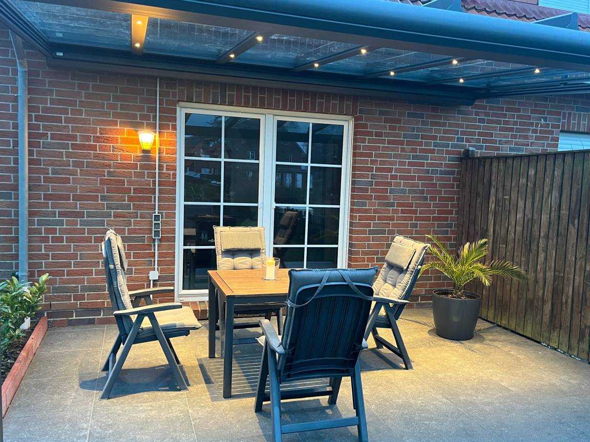 windgeschützte, überdachte Terrasse mit Gartenmöbeln und Markise und für den Sommer ein Grill