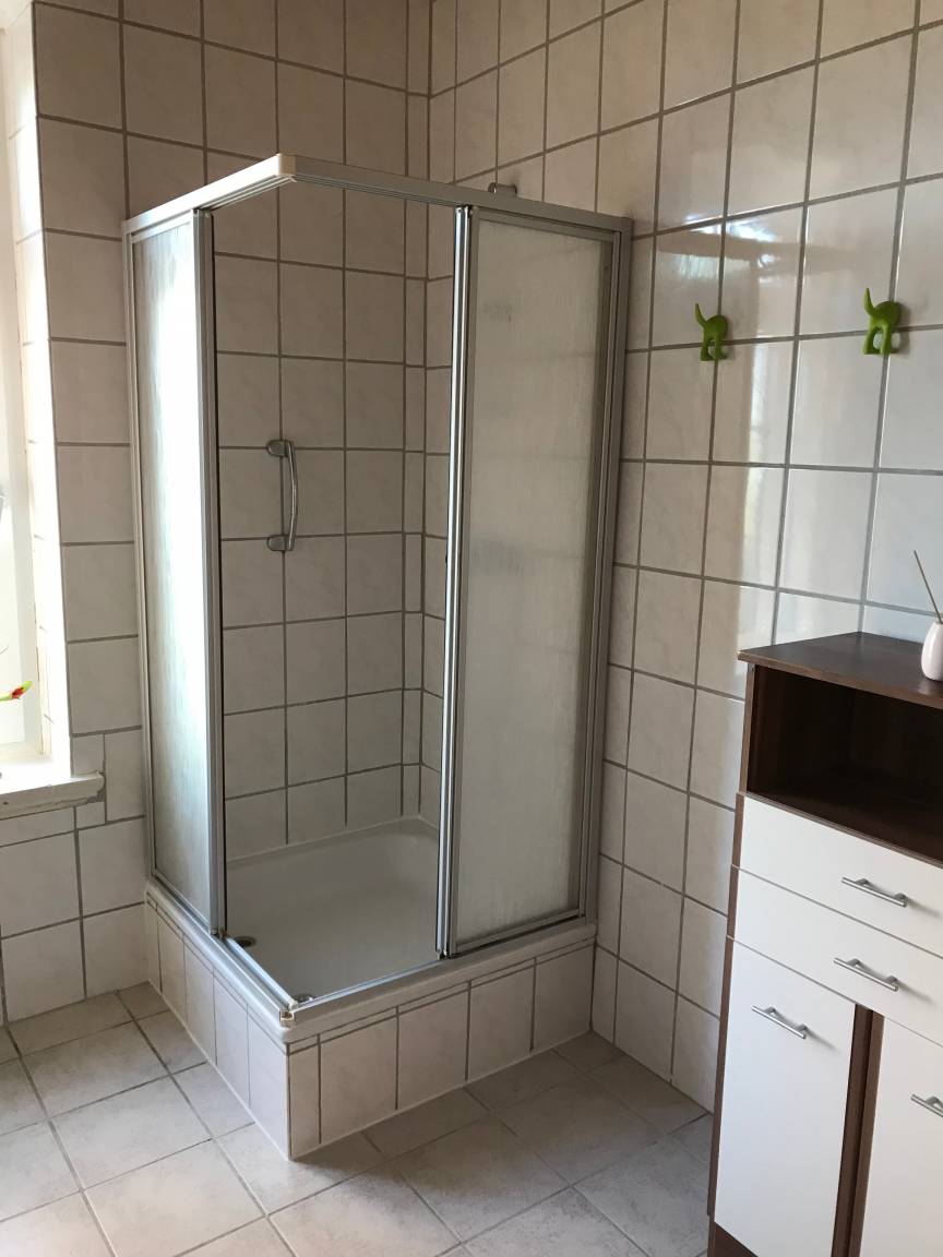 Das Badezimmer ist mit einer Dusche ausgestattet.
