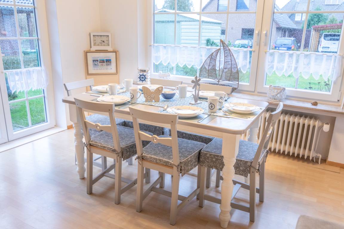 Das Haus befindet sich in einer ruhigen Seitenstraße (Achtung! Einbahnstraße) des historischen Küstenortes Dornum. Einkaufsmöglichkeiten, Ärzte, Apotheke, Bäcker usw. sind trotzdem ein einem Radius von ca. 700m Fuß läufig zu erreichen. Ebenso ist man in nur wenigen Minuten (200m) in der Natur, was für Hundefreunde nicht unwichtig sein dürfte. Die Umgebung bietet ein gut ausgebautes Fahrradwegenetz und die Küste ist nur ca. 8 km entfernt.