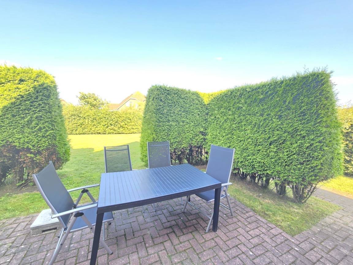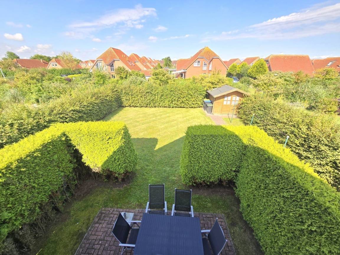 Das komfortable Ferienhaus bietet einen großzügigen Außenbereich, der ideal für Familien ist. Direkt neben dem Haus stehen bis zu zwei PKW-Stellplätze zur Verfügung. Die Terrasse, erreichbar über den Wohn- und Essbereich, führt zu einer großen Spiel- und Liegewiese. Hier gibt es viel Platz zum Toben, Spielen oder Entspannen. Am hinteren Rand des Grundstücks befindet sich eine Gartenhütte mit nützlichen Utensilien wie Gartenmöbeln, Fahrrädern mit Kindersitzen, einem Grill sowie Sandspielzeug. Diese umfangreiche Ausstattung sorgt für abwechslungsreiche Aktivitäten und gemütliche Stunden im Freien. Für einen erholsamen Aufenthalt eignet sich dieser Außenbereich hervorragend, ihn zu nutzen wird empfohlen. Die sichere und kinderfreundliche Umgebung macht den Außenbereich zu einem besonderen Highlight dieses Ferienhauses.