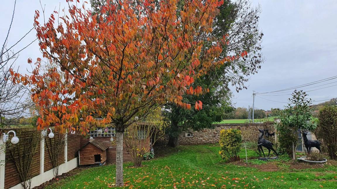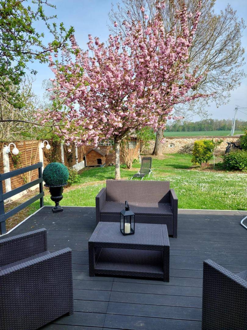 Ihr Außenbereich: Privater Parkplatz. Eingezäunter Garten mit Bäumen und Blick auf den Doue-Hügel, Terrasse, Gartenmöbel, Grill und Liegestühle