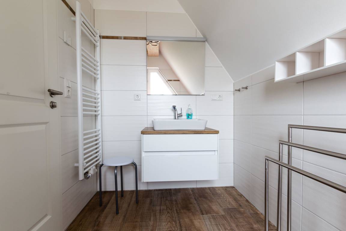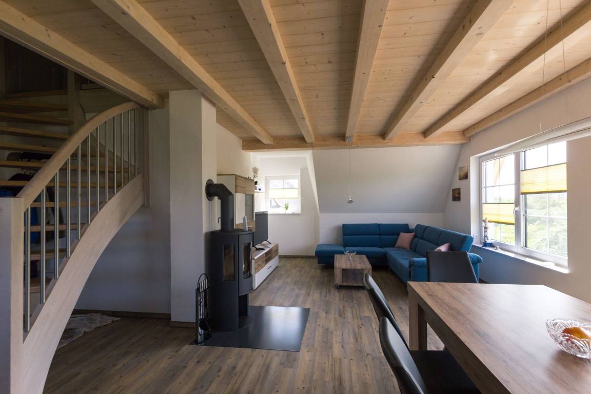 Die Ferienwohnung, die sich im OG und DG befindet, verfügt über zwei Schlafzimmer, zwei Bäder mit Dusche & WC, einem großzügigen Wohn- und Essbereich mit offener Küche. Es ist eine Nichtraucherwohnung.