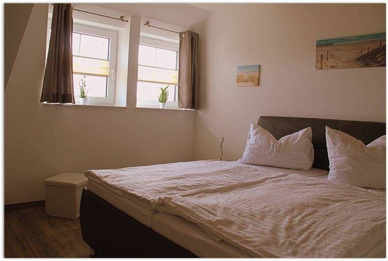 Für ein gemütliches Frühstück stehen Ihnen eine Kaffeemaschine, ein Toaster sowie ein Wasserkocher zur Verfügung. Das Abwaschen übernimmt ein moderner Geschirrspüler, so dass Sie sich Zeit für die schönen Dinge des Lebens nehmen können. In den zwei Schlafzimmern befinden sich je ein großes Doppelbett mit einer Liegefläche von 2,00 m x 1,80 m, zwei Nachtschränke und ein Kleiderschrank. Auf einer Kommode steht Ihnen ein Smart-TV mit Internetanschluss zur Verfügung.