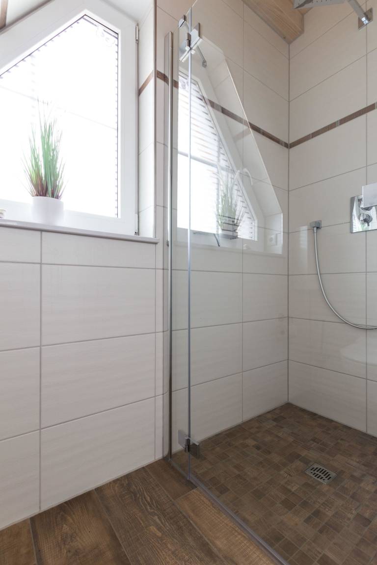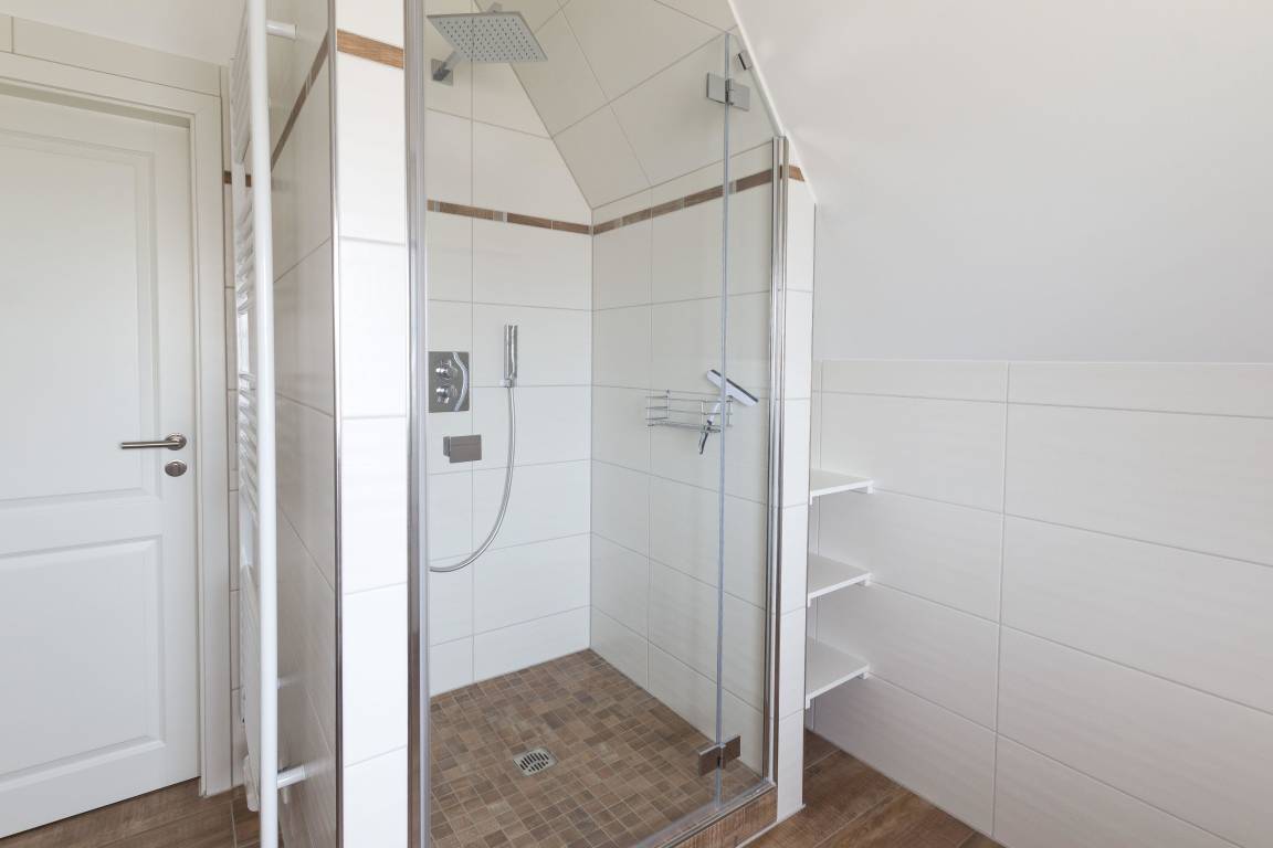 Die Badezimmer sind mit einem modernen Waschtisch und einer begehbaren Dusche ausgestattet.