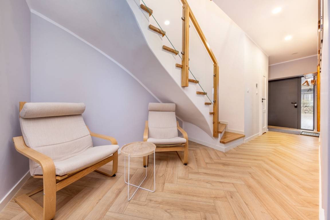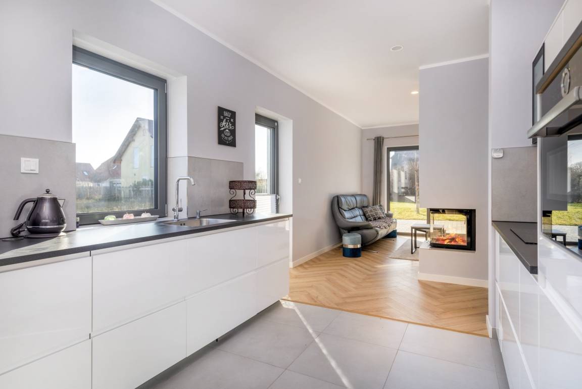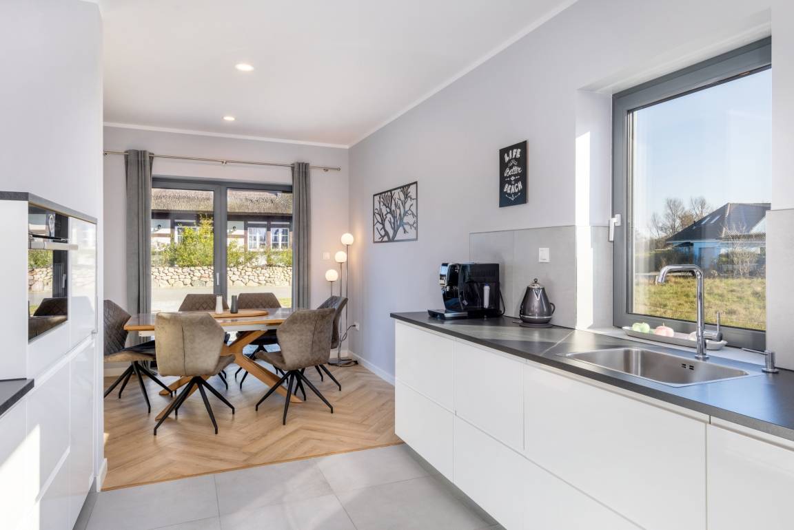 Die offene, moderne Küche bietet Ihnen alles, was Sie in Ihrem Urlaub zum Kochen benötigen. Die gemütliche Atmosphäre im Wohnbereich ist ideal für Familie und Freunde und ist mit einem großen Smart-TV ausgestattet. An kalten Tagen und Abenden sorgt der Kamin für kuschelige Wohlfühlatmosphäre. Die Sauna mit Dusche erreichen Sie direkt vom Flur aus.