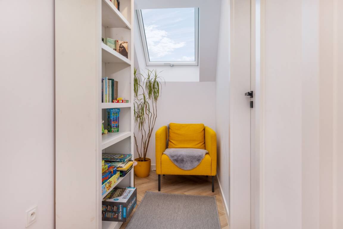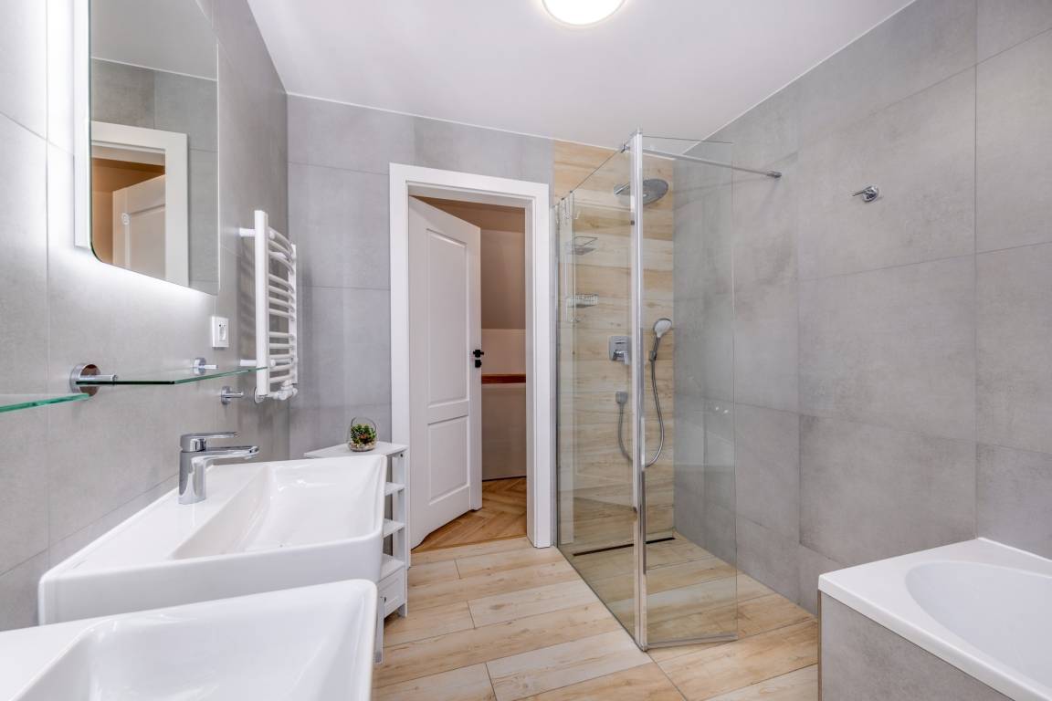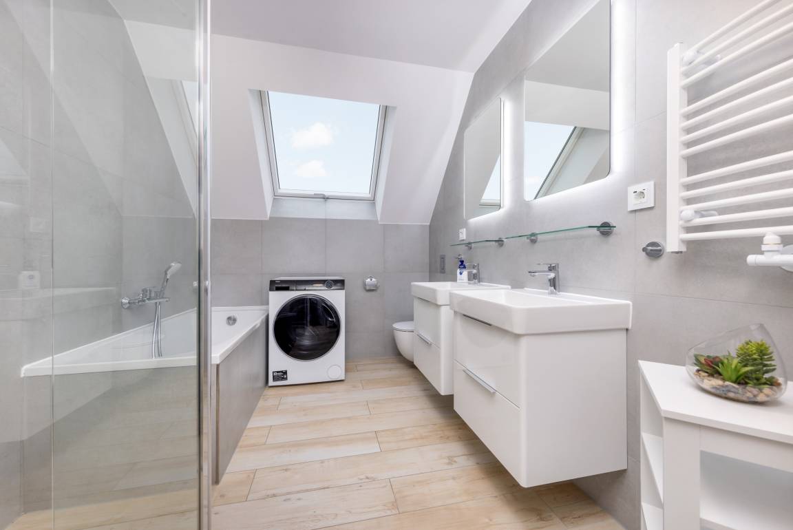 Im Obergeschoss befinden sich insgesamt drei Räume, die als Schlaf- und Aufenthaltsräume für Eltern und Kinder ausgestattet sind, sowie ein großes Badezimmer mit Wanne, ebenerdige Dusche, Doppelwaschtisch und WC.