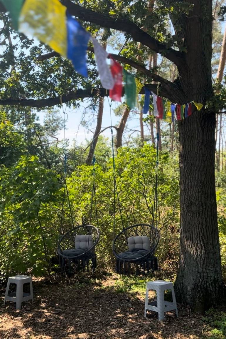 Genießen Sie Natur und Ruhe im Retreat. Hängesessel und eine Yoga Schaukel direkt am angrenzenden Wald der Ferienwohnungen.