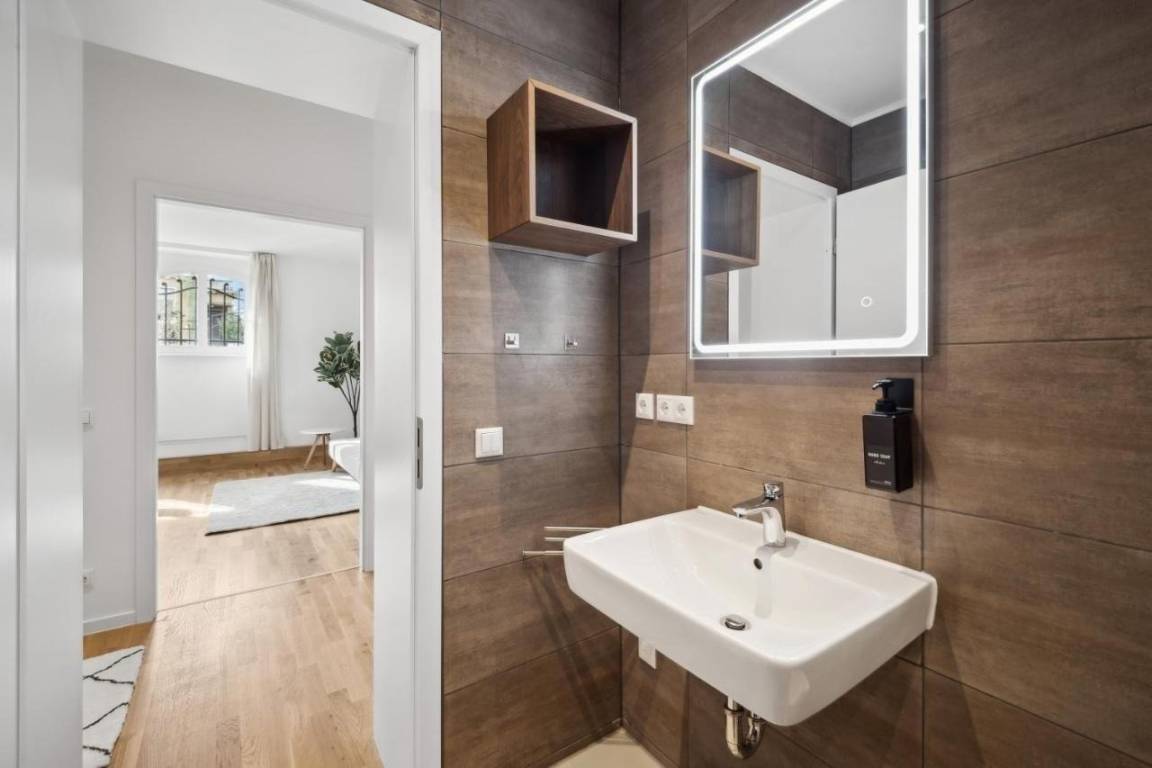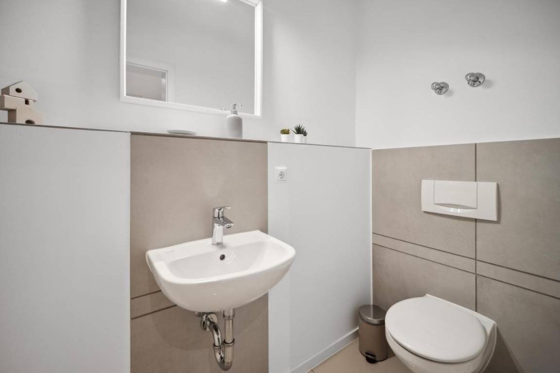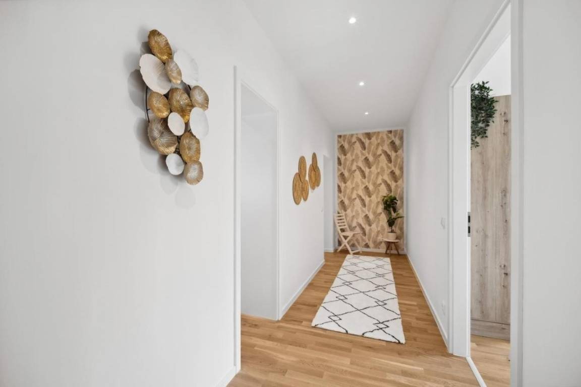 Das geräumige 128 m² große Apartment ist perfekt für Familien oder Gruppen bis zu 7 Personen. Drei Schlafzimmer bieten flexible Schlafmöglichkeiten: ein Doppelbett, zwei Einzelbetten und vier Schlafsofas. Der offene Wohn- und Essbereich lädt zum Verweilen ein. Die voll ausgestattete Küche verfügt über Spülmaschine, Backofen, Toaster und eine Nespresso-Kaffemaschine mit Milchaufschäumer. Im modernen Badezimmer mit Dusche stehen Handtücher, Pflegeprodukte und ein Haartrockner bereit. Eine Waschmaschine inkl. Wäschetrockner sorgen für zusätzlichen Komfort. Kostenloses WLAN, ein Smart-TV und ein Schreibtisch machen die Unterkunft auch für Geschäftsreisende attraktiv. Die große Terrasse mit Gartenblick bietet Platz zum Entspannen. Babybett und Hochstuhl sind auf Anfrage verfügbar.