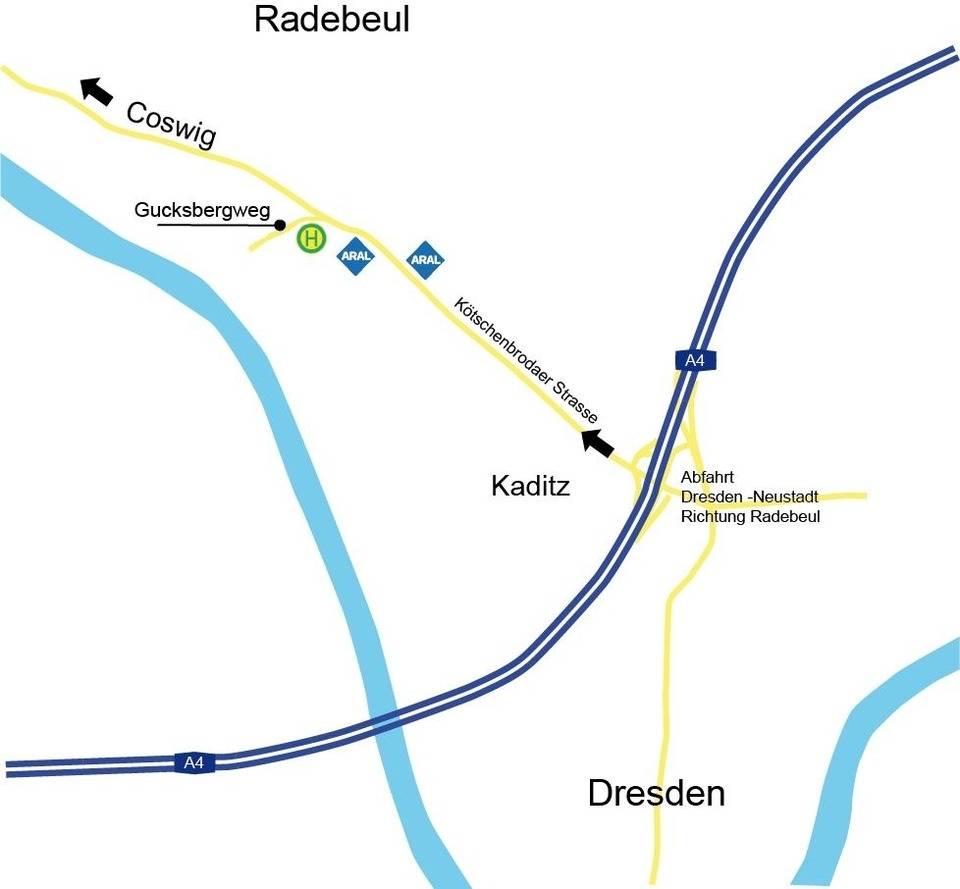 Dresden-Kaditz liegt im Nordwesten von Dresden, ein Stadtrandgebiet, direkt am Elberadweg. Mit öffentlichen Verkehrsmitteln gelangen Sie problemlos in die Innenstadt Dresdens. Auch in der Nachbarstadt, der Wein- und Gartenstadt Radebeul gibt es sehr viel zu entdecken (u. a. Karl-May-Museum, Schmalspurbahn, Weinberge). Nicht weit ist es nach Meißen der Porzellanstadt (ideal dazu der Elberadweg) , dem Jagd- und Lustschloß Moritzburg , in die Wanderparadiese Sächsische Schweiz oder Linkselbische Täler.